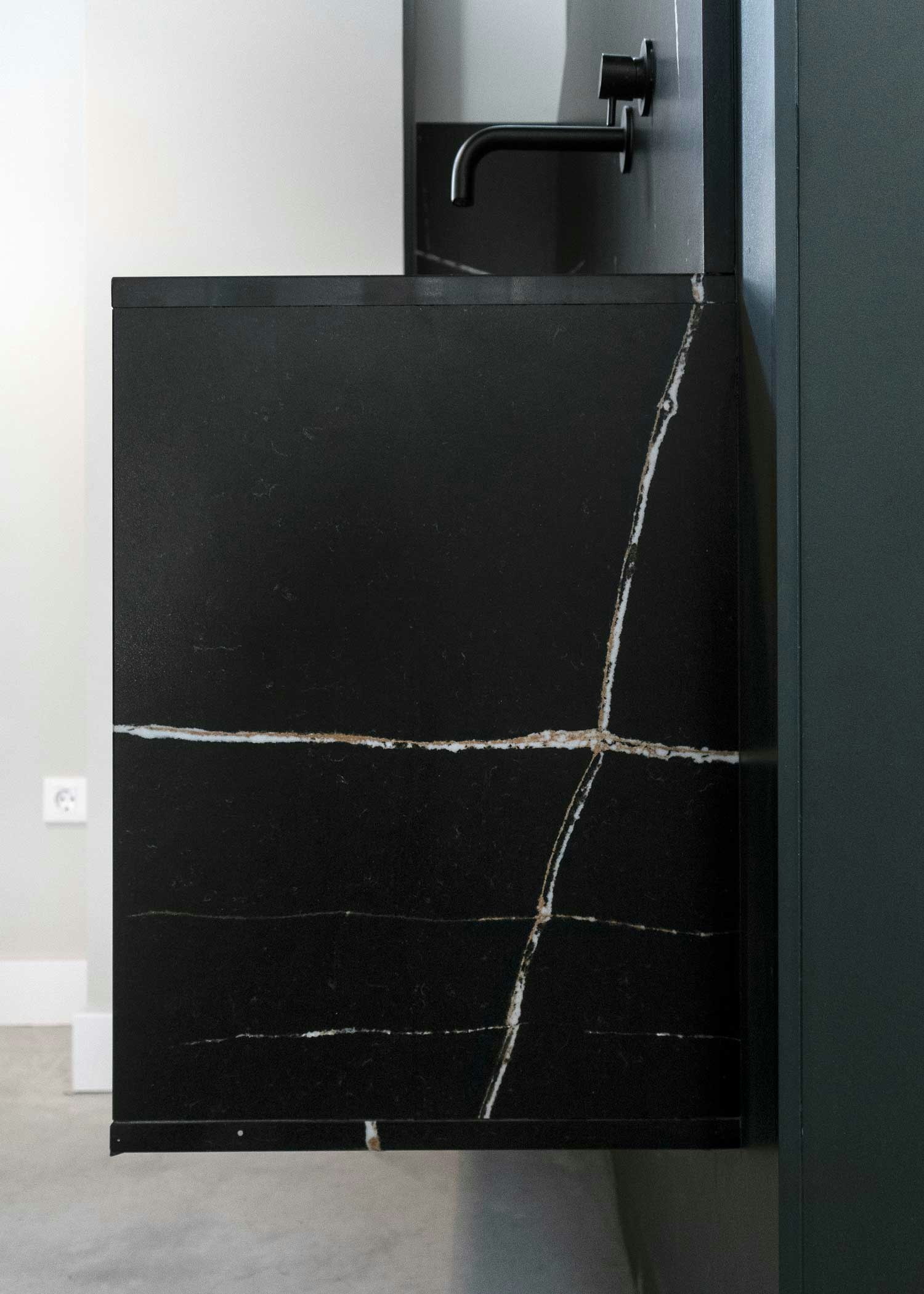 For this purpose, Rodríguez Alcalá chose Dekton for the cladding and flooring of the new offices and Silestone for the worktops of the small kitchen-office and bathroom. To do so, he used a wide range of finishes and colours in various formats, from Dekton Feroe, Laos and Liquid to the classic Silestone Eternal Noir and Calacatta Gold.
