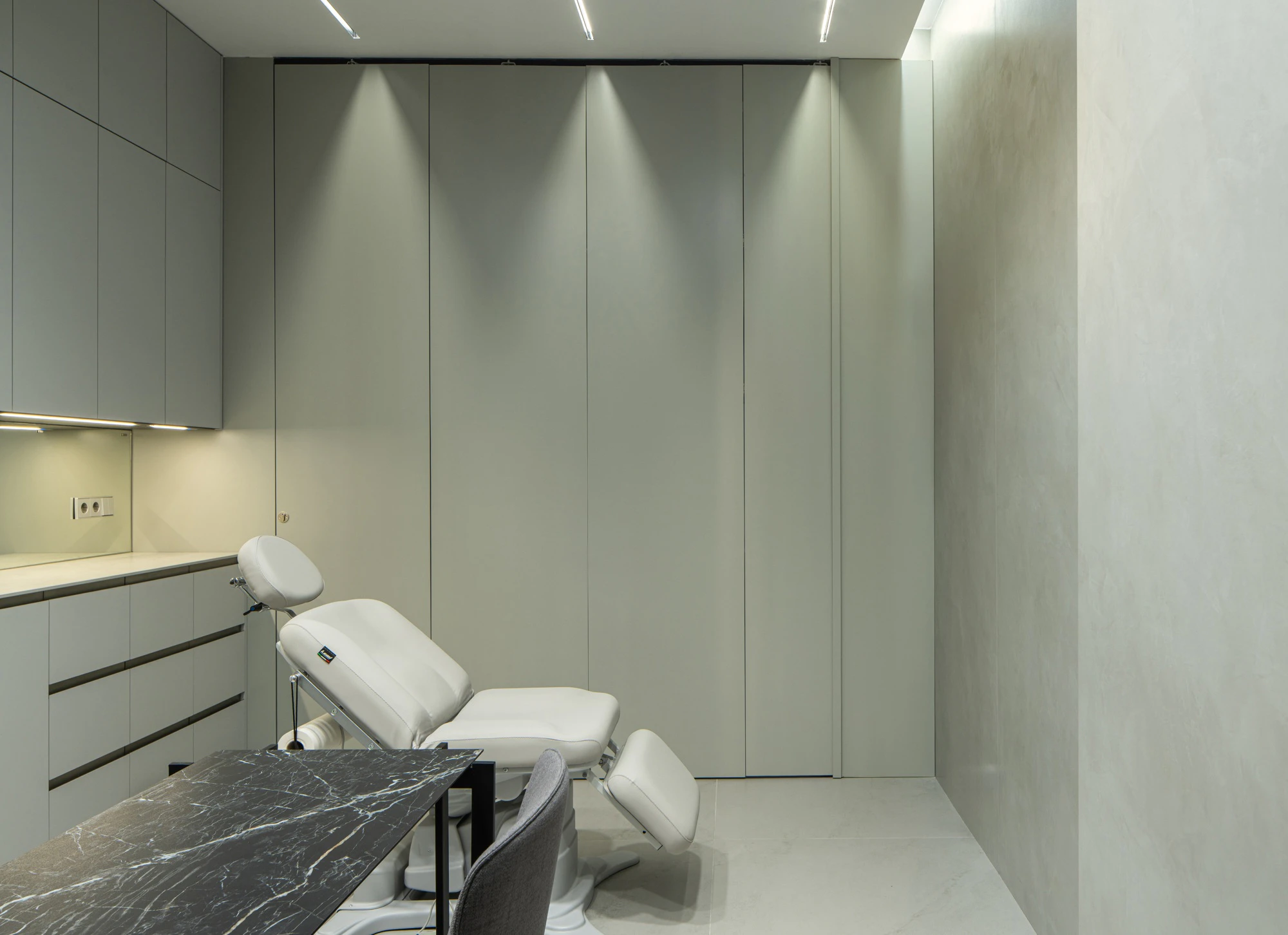 One of the colours chosen for the flooring was Dekton Somnia, a deep black with veins in brown and oxidised white, which also extends to the wall, some custom-made furniture for the project, and the façade. In the consultation rooms, with softer tones, Dekton Kovik was selected thanks to its light neutral shade and subtle natural veining.