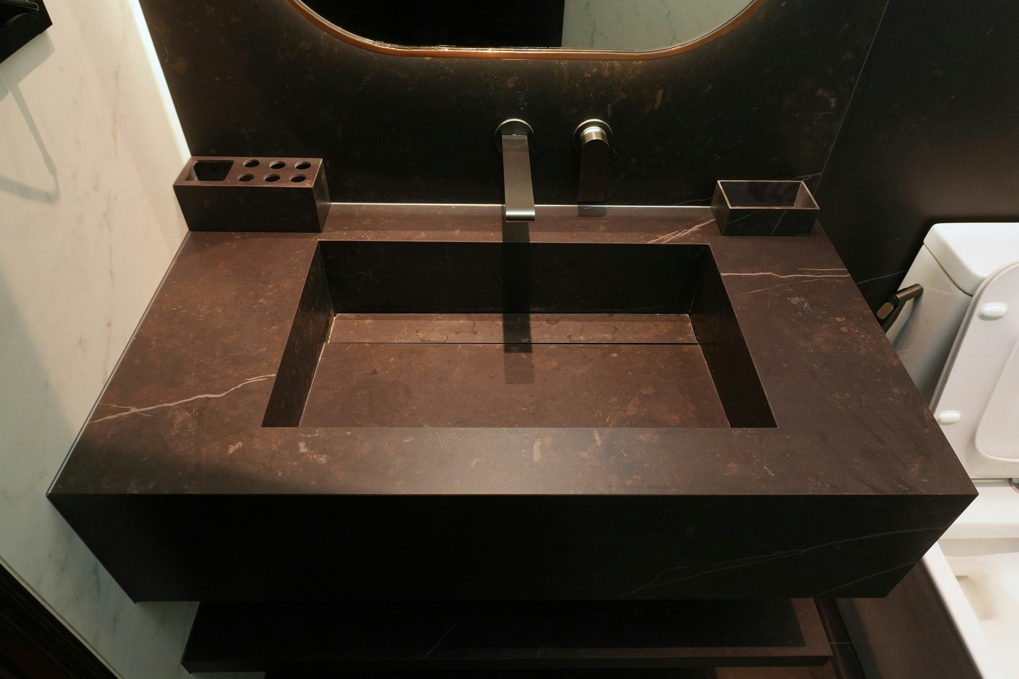 “In the bathroom, the flooring stands out for its artistic composition made with contrasting Dekton slabs, creating a modern layout with great visual impact. As a complement, a freestanding monolithic Dekton washbasin and a bespoke Dekton toothbrush holder showcase exceptional craftsmanship and strong material coherence. Together, these elements form a luxurious and continuous space, becoming one of the defining aesthetic highlights of the entire project,” the studio explains. Both the bespoke washbasin and toothbrush holder demonstrate the versatility and artistic possibilities of Dekton, as well as the meticulous work of Eurostone.