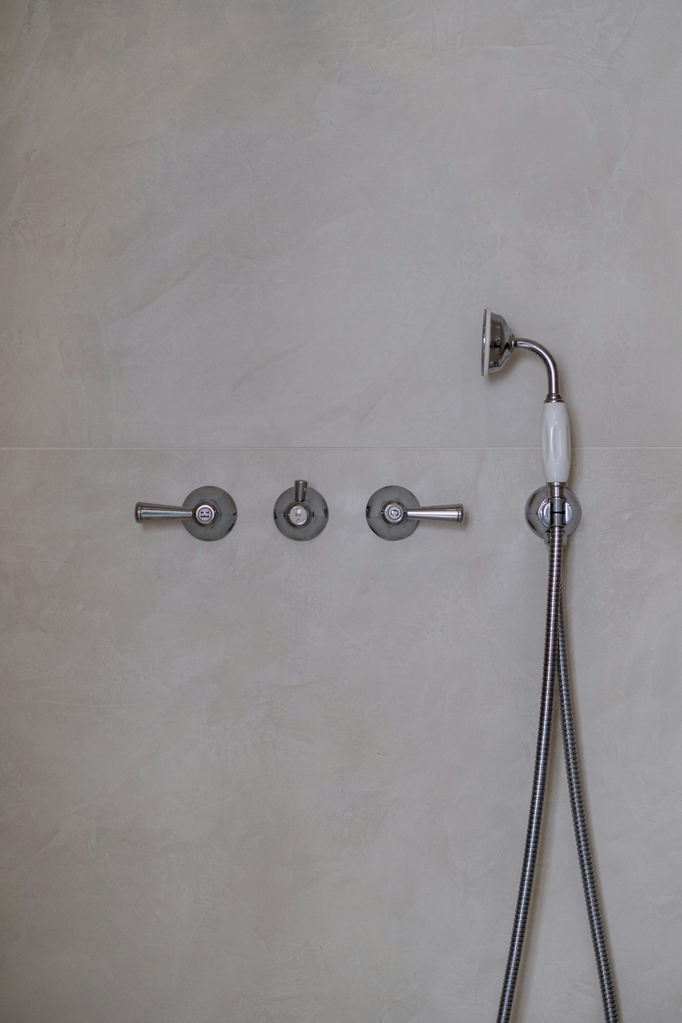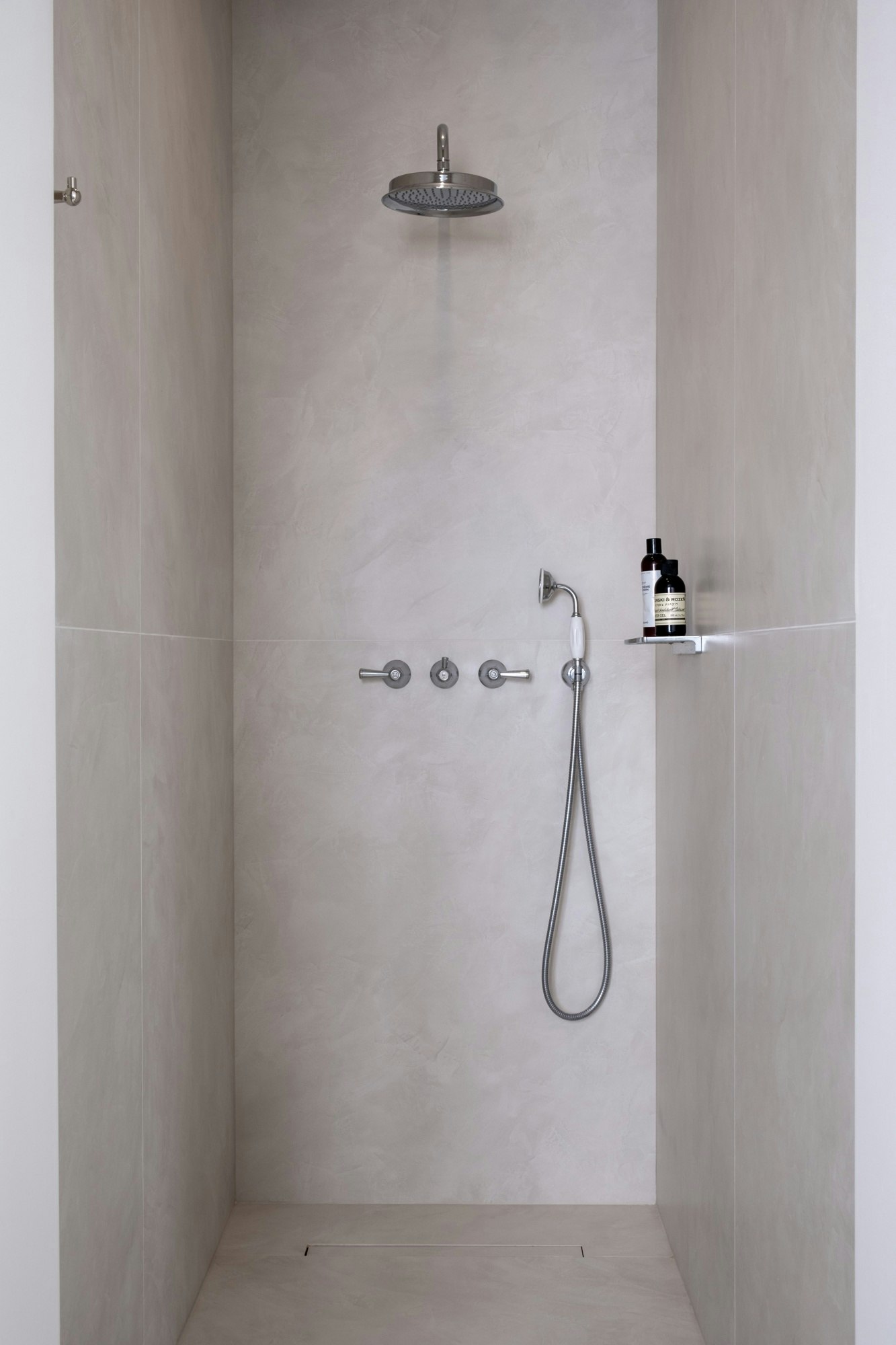 La salle de bain parentale affirme un style plus Hamptons avec la pierre naturelle Sensa Siberia, rendue totalement imperméable grâce au traitement SenGuard, qui protège la matière tout en valorisant ses veinages subtils, et se distingue par un raffinement supplémentaire avec un bec de corbin en finition. Le sol et la douche se parent de Dekton Albarium, effet béton ciré en grands formats, qui réduit les joints pour créer une continuité visuelle élégante et une facilité d’entretien au quotidien.