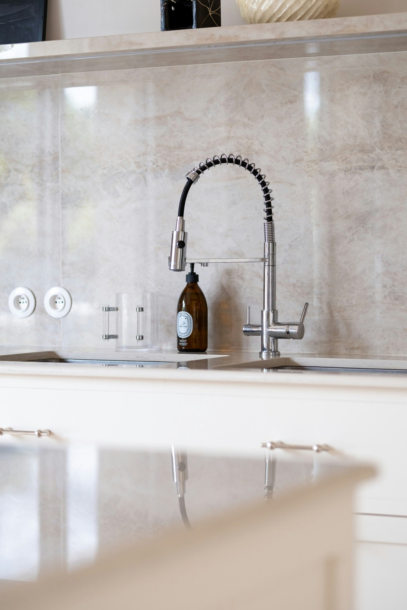 Dans la cuisine, le plan de travail en Dekton Arga, inspiration Taj Mahal, associe douceur minérale et résistance aux usages quotidiens, permettant de poser casseroles et plats sans contrainte tout en profitant d’un entretien simplifié.