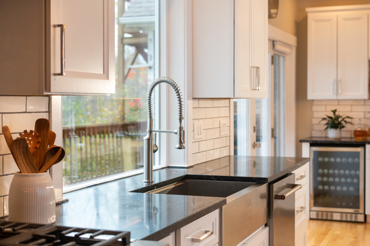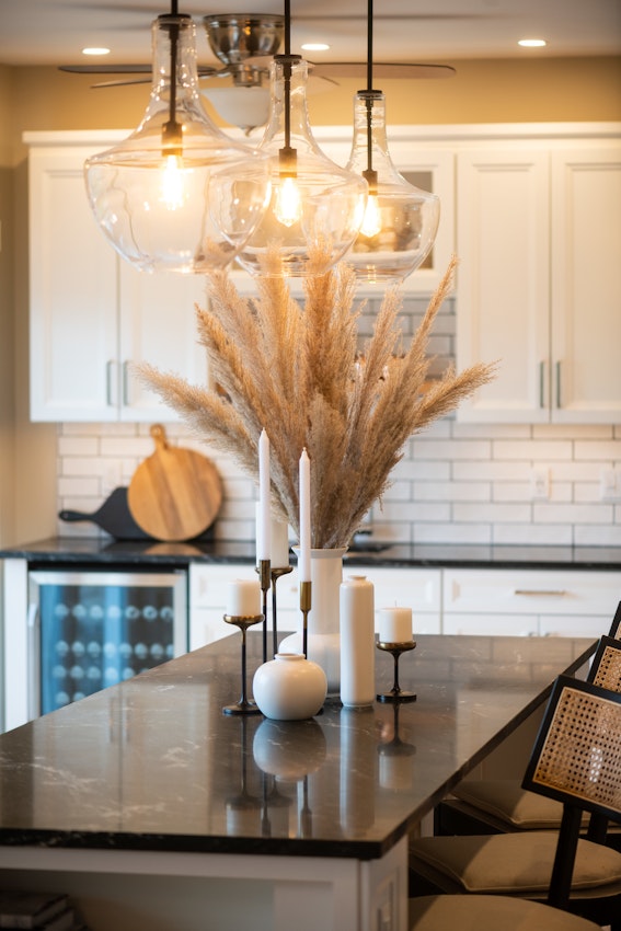 This design features a beautiful contrast with Sensa on painted white cabinets. The striations and movement of the stone is stunning.