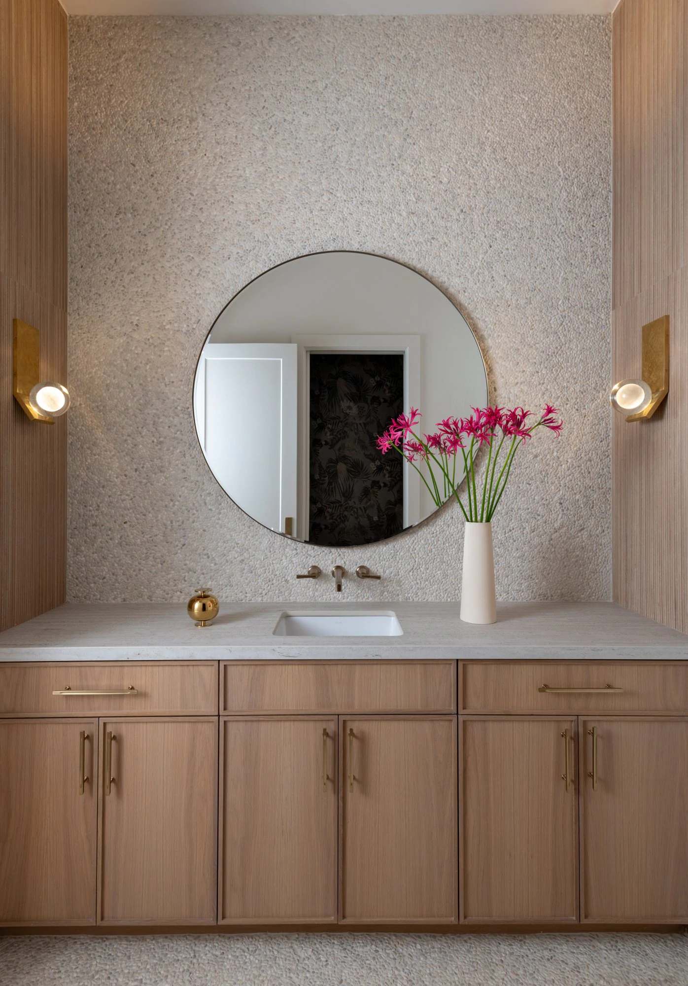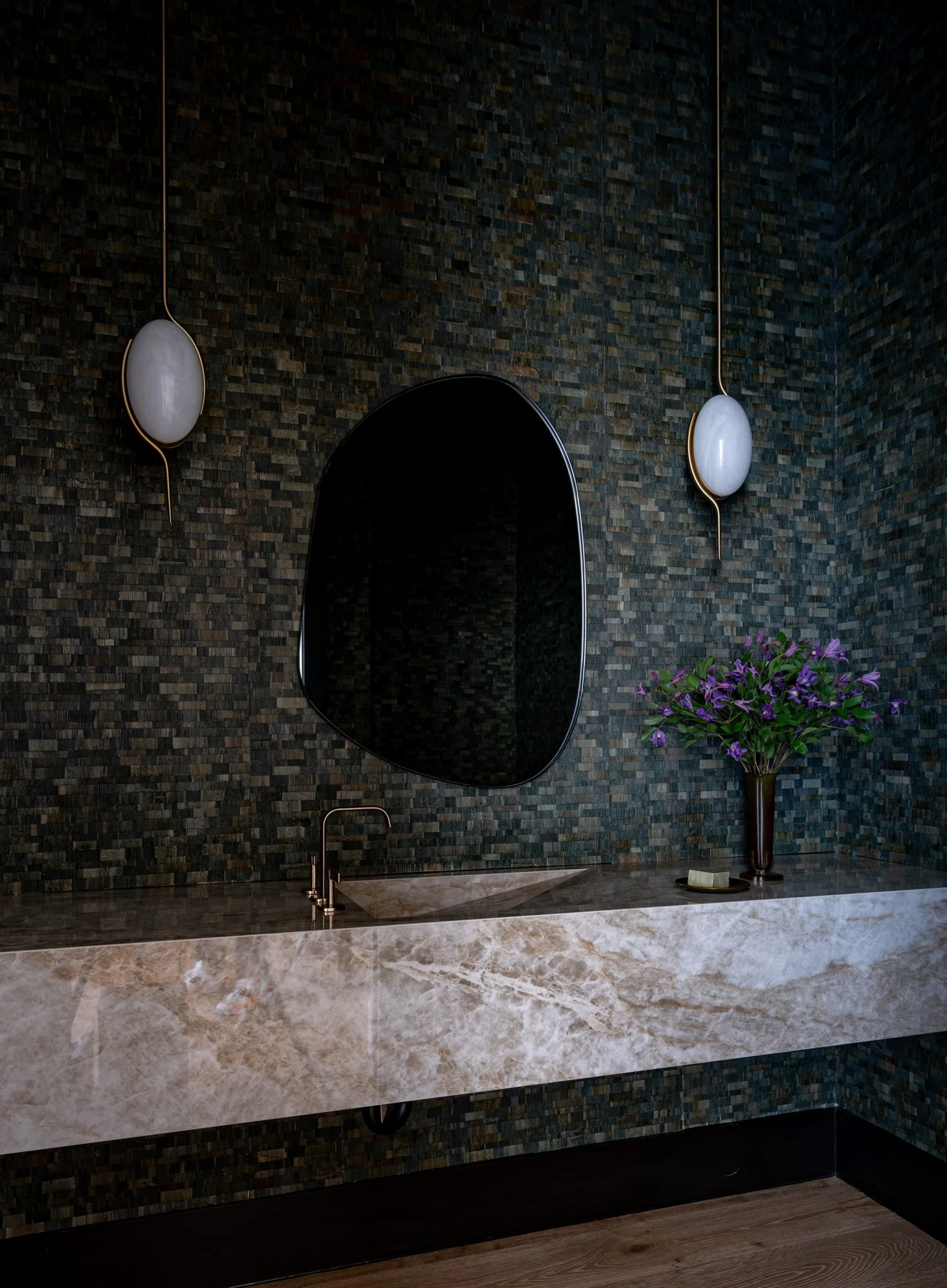 In the game room, Dekton Marmorio forms a waterfall edge and continues seamlessly between interior and exterior bars. The primary bath features a sculptural island-style vanity in Dekton Neural with a dramatic drop edge, while the powder room showcases a fully clad floating vanity in Dekton Taga with an integrated side-draining sink.