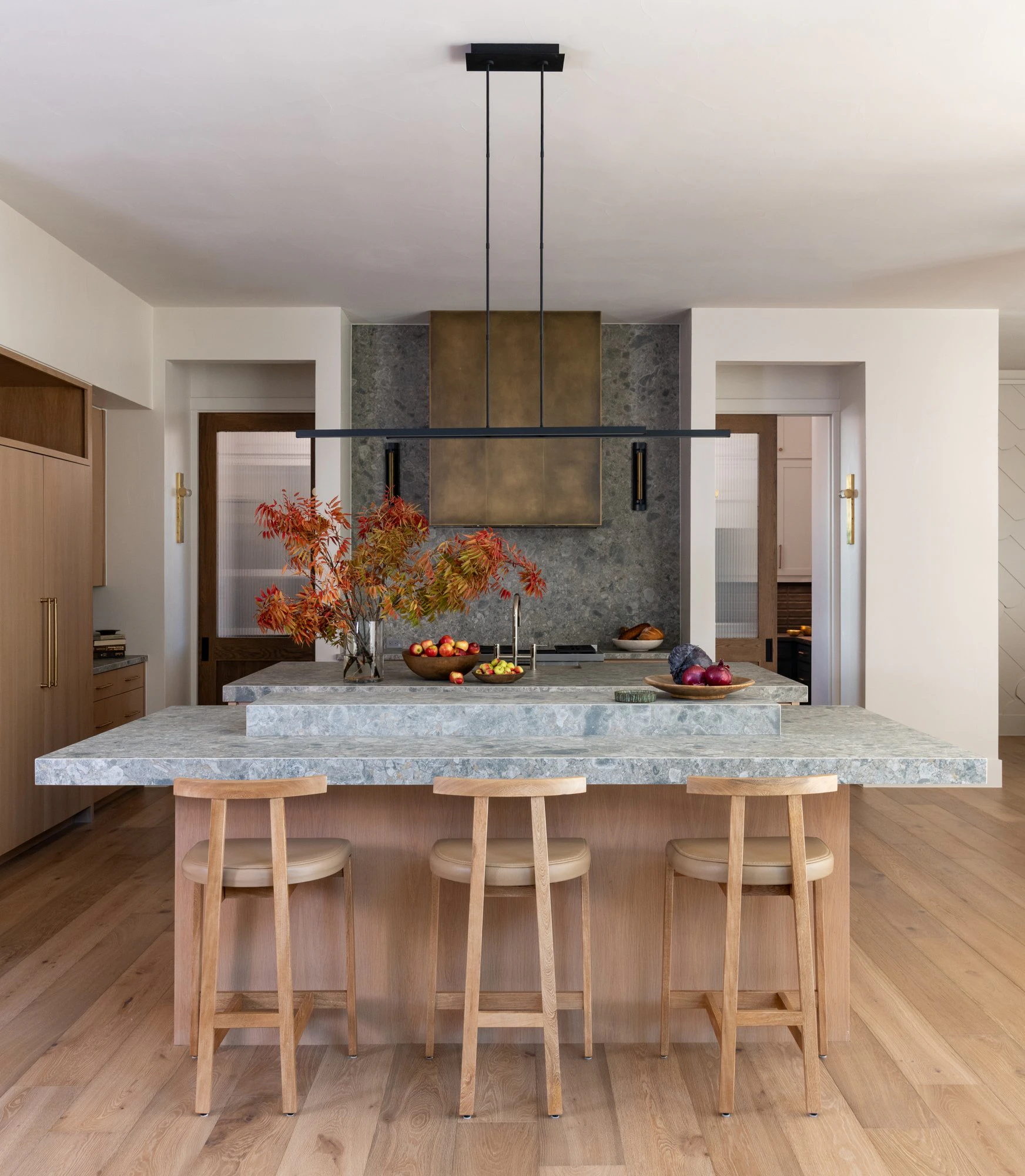 Cosentino materials were selected to meet the dual demands of performance and design flexibility. In the wine bar, Silestone Charcoal Soapstone was fabricated into a pronounced radius curve, setting the tone for the custom applications throughout the home. The main kitchen pairs Dekton Ceppo countertops with a tall backsplash and raised island detail, creating visual impact while standing up to daily cooking and entertaining.