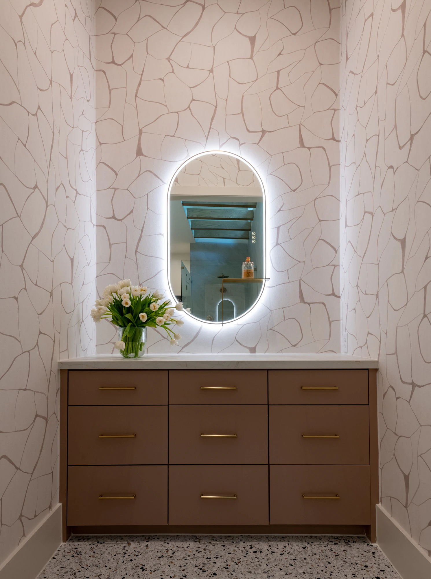 Expansive windows flood the interiors with natural light and frame backyard views, reinforcing a strong indoor-outdoor connection. A grounded palette of earthy tones anchors the spaces, while unexpected complementary accents in paint, furnishings, and art introduce personality and energy. The result is a home that feels relaxed and welcoming, yet highly considered in every detail.