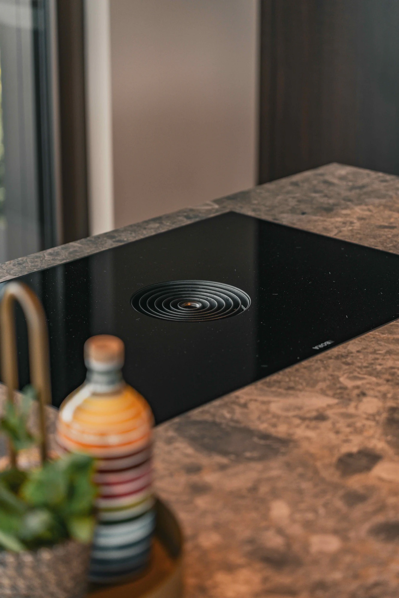 Since this continuity was important for the kitchen's appearance, large Dekton slabs were chosen, allowing for a clean and precise aesthetic language. “Dekton Ceppo allowed us to maintain a refined and architectural image for the project, while ensuring suitable performance for a contemporary kitchen,” Lindau states.