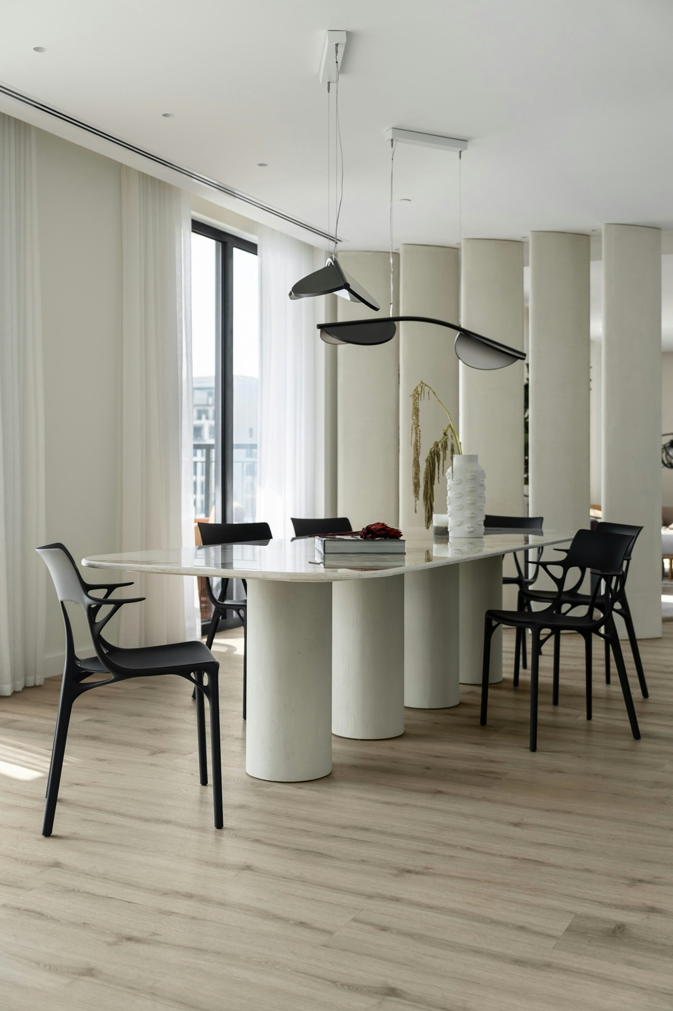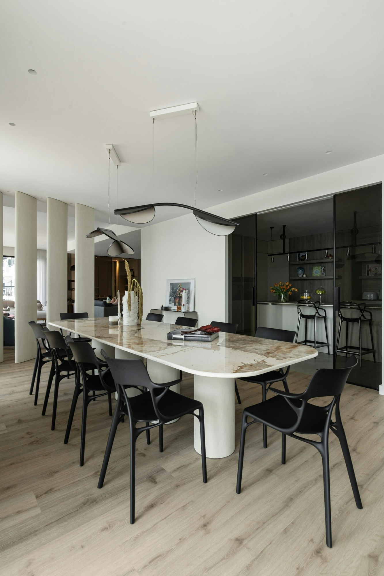Meanwhile, the dining area is integrated into the main space as a central feature. The custom-designed table is made of Dekton Khalo and rests on textured cylindrical bases. Its presence defines the area without the need for additional enclosures and is complemented by Almendra lights by Flos, AI chairs by Philippe Starck, and movable architectural panels that allow the degree of separation between spaces to be adjusted according to usage needs.