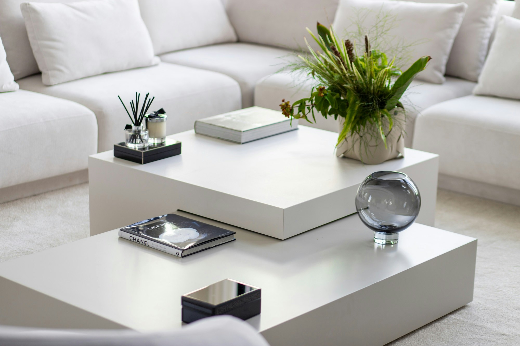 The use of Cosentino materials also extends to furniture and auxiliary elements. In the living room, a coffee table made of Silestone White Zeus reflects natural light and reinforces continuity with adjacent spaces. Its smooth and durable surface allows for everyday use without wear, maintaining the purity of the design.