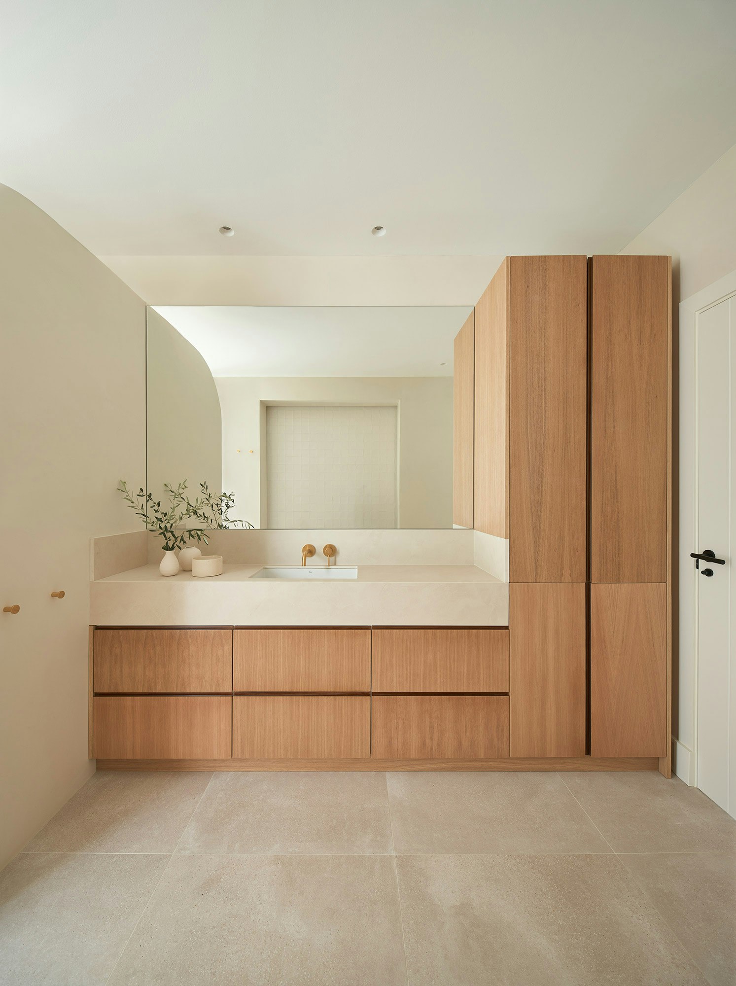 Oak wood is the star of this project, where it has been used particularly in the kitchen and bathroom. The rest of the materials used, such as microcement and paint, are all part of the same colour range, giving a natural feel to the different spaces. The living room and kitchen are connected by a central partition wall with shelves and alcoves on both sides, providing plenty of storage space for both rooms. Large windows connect the interior to the garden and swimming pool, blurring the boundaries between inside and out. A floor-to-ceiling solid door separates the private bedroom and bathroom area from the rest of the house.