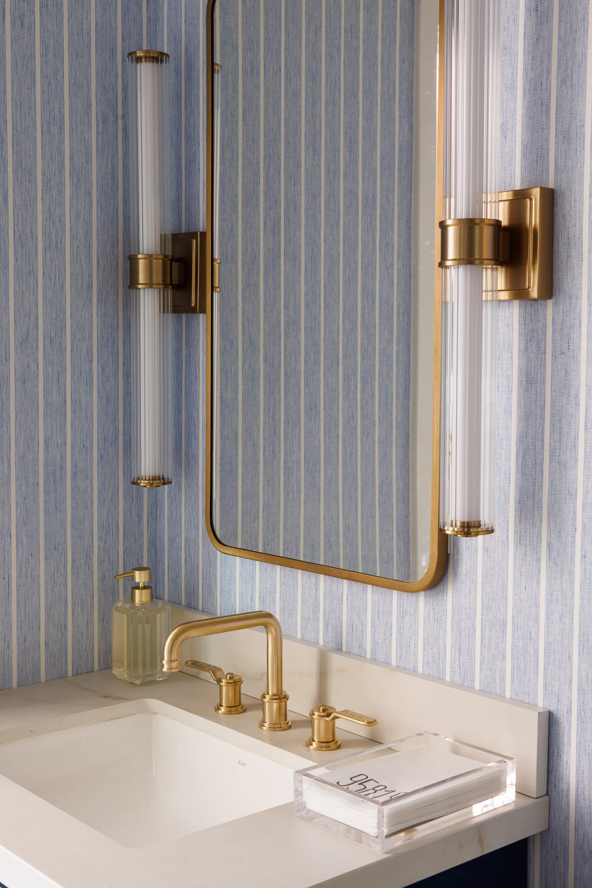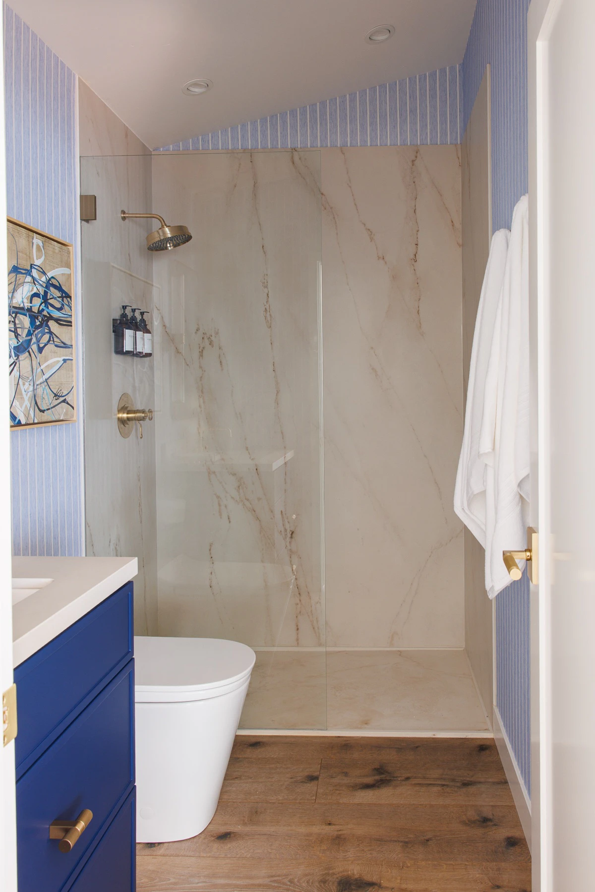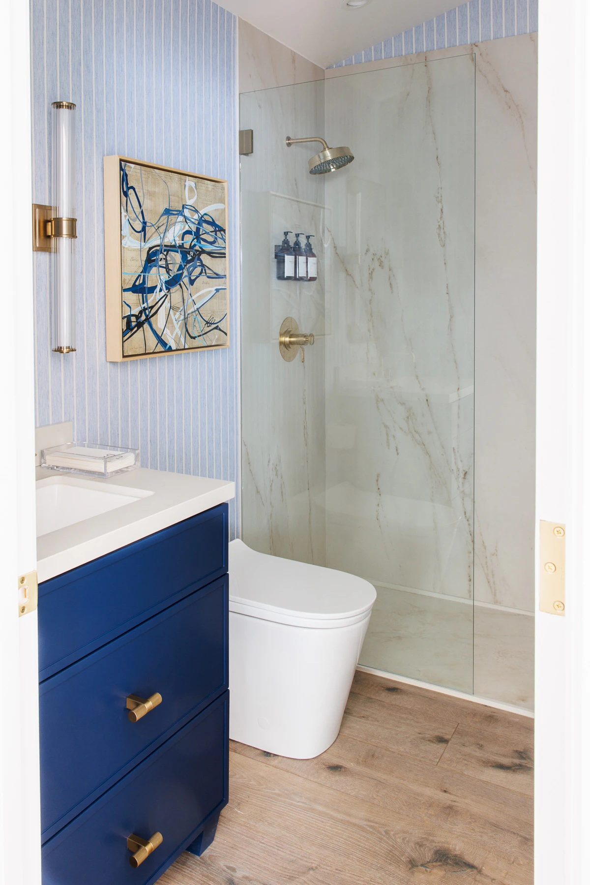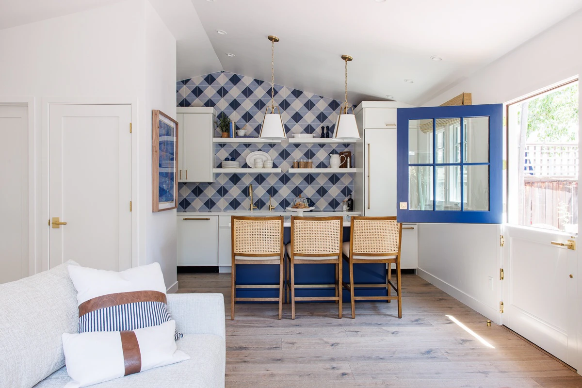 Inspired by decades-long relationships with trusted brand partners, the ADU serves both as a personal sanctuary and a living showcase of thoughtful collaboration. The aesthetic is light, curated, and timeless, echoing the main home while embracing a more minimalist approach to maximize the compact footprint. Soft blues, warm neutrals, and layered textures bring a sense of calm and cohesion throughout.