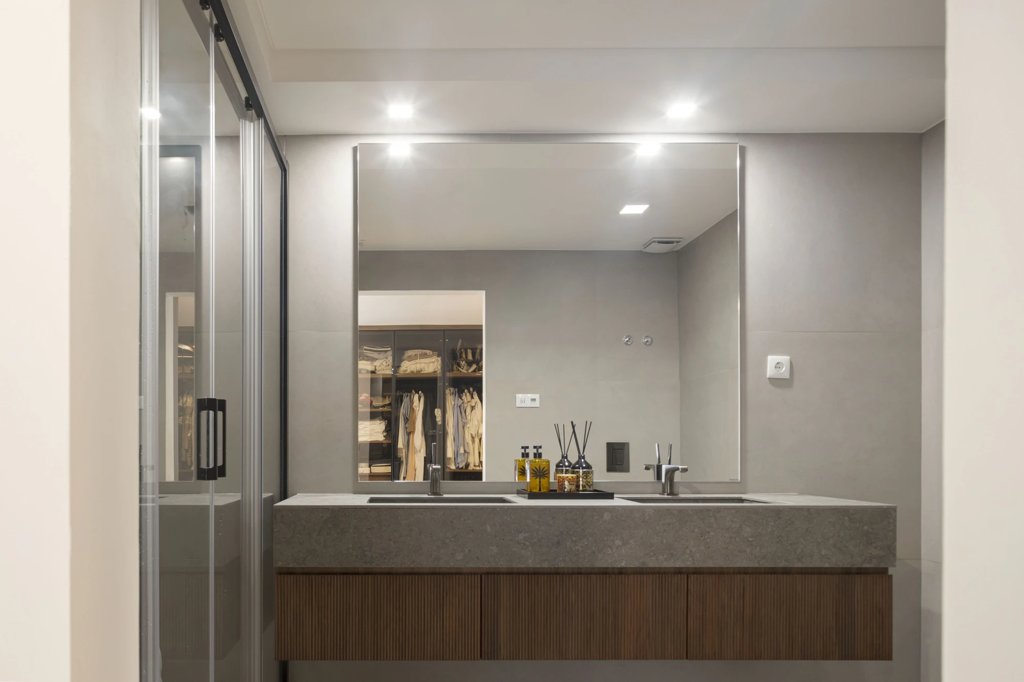 To continue with that brutalist and industrial aesthetic, yet minimalist and simple, Dekton Grafite was chosen for the bathroom worktop. Its dark base, a mix of black and grey interspersed with whitish and reddish cloud-like spots, reinterprets the texture of fine-grained dark limestone. The double sink features a wooden slatted cabinet underneath with a slight oriental touch. The rest of the bathroom, in grey, helps maintain the aesthetic that dominates the rest of the project.