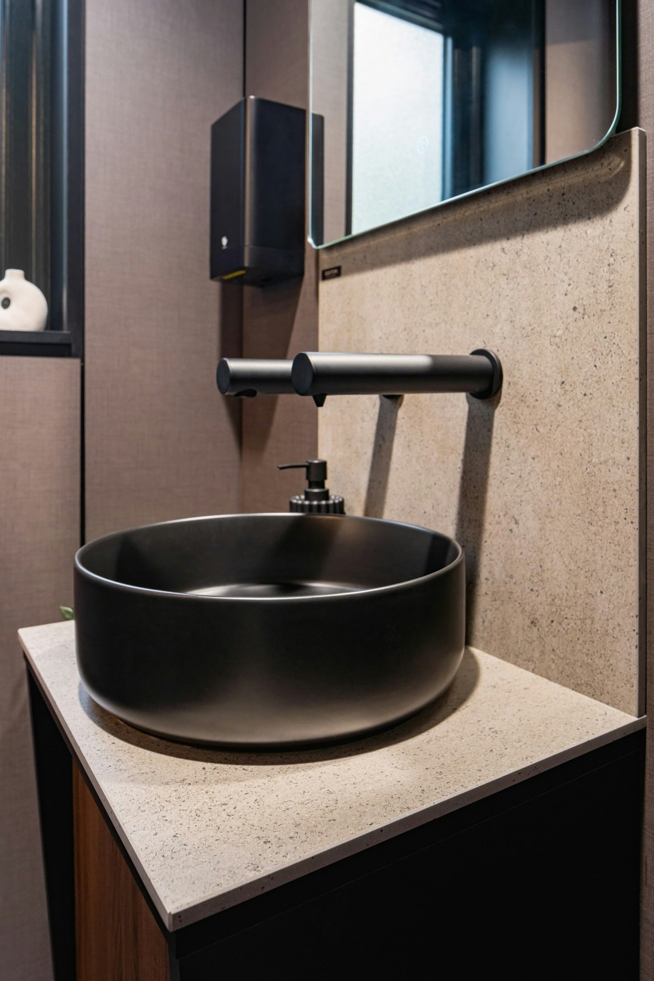 Dekton was also incorporated inside the pods, in splashbacks, kitchenette worktops, and vanity tops. This reinforces material continuity and elevates the overall design language. “Using Dekton inside just made sense,” Ashley said. “It ties everything together visually, and it means clients get a product that performs as good as it looks.”