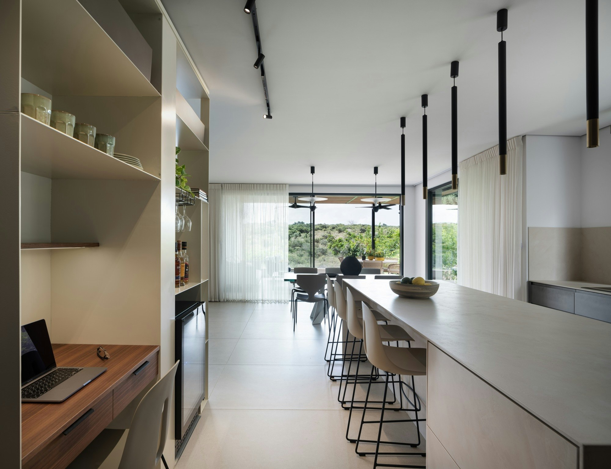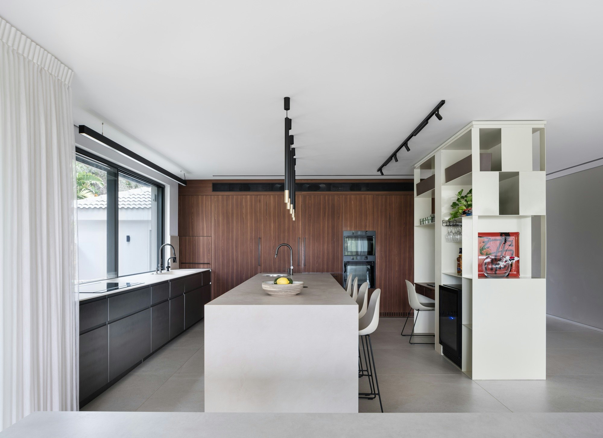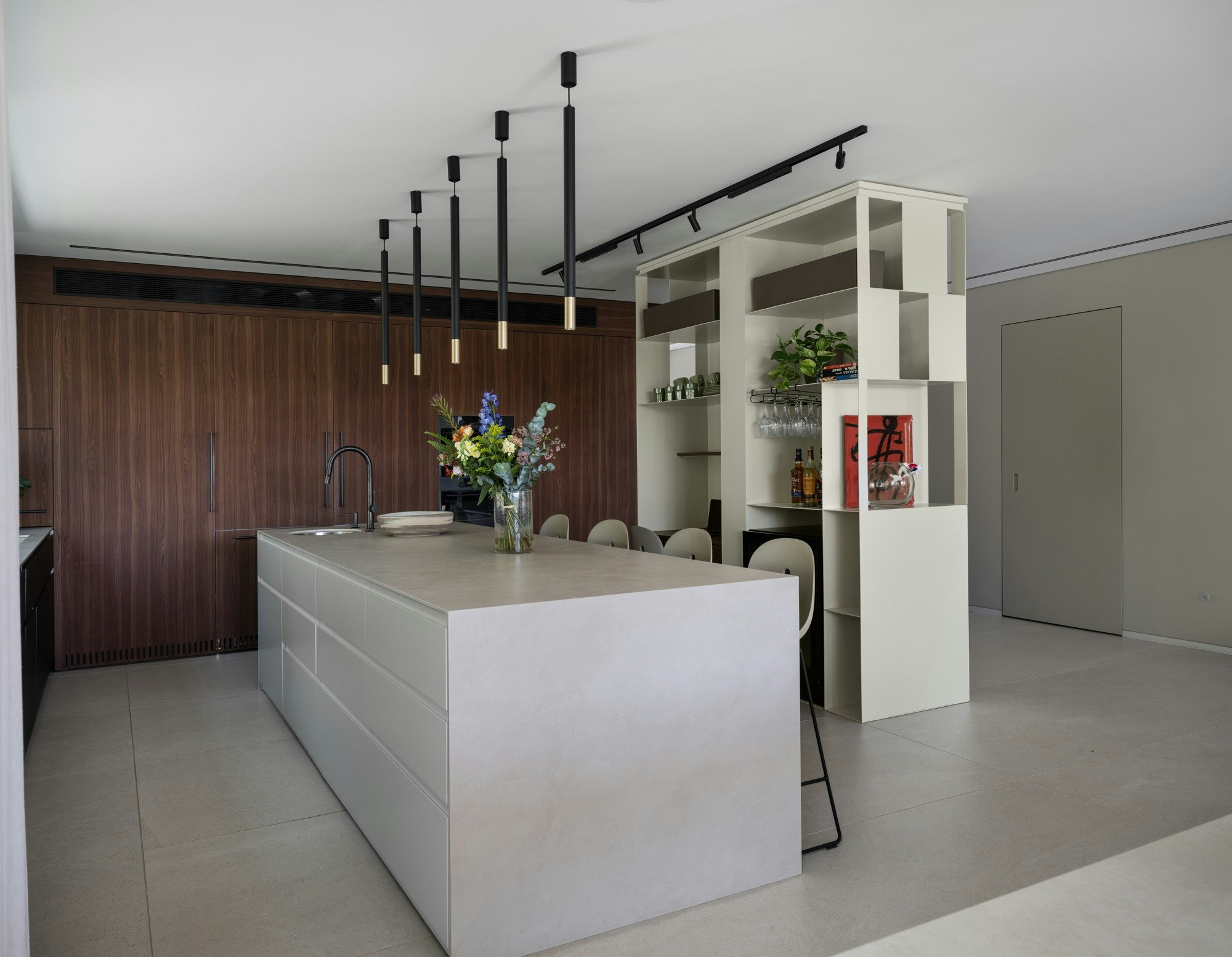 בפנים, המטבח עבר שינוי עם משטח עבודה בצורת L מ-Dekton Nacre, כולל חיפוי הארונות ורגלי האי. חומר זה נבחר בשל עמידותו, קלות הניקוי, עמידותו לשימוש יומיומי והמראה הניטרלי והאלגנטי שלו, שמתאים בדיוק לגישה "נקי, פרקטי ועל-זמני" של האדריכלית. למעשה, המוטו שלה בפרויקטים הוא לבחור משטחים שעמידים לשימוש יומיומי, מסתירים לכלוך וקלים לתחזוקה, מבלי להתפשר על העיצוב.