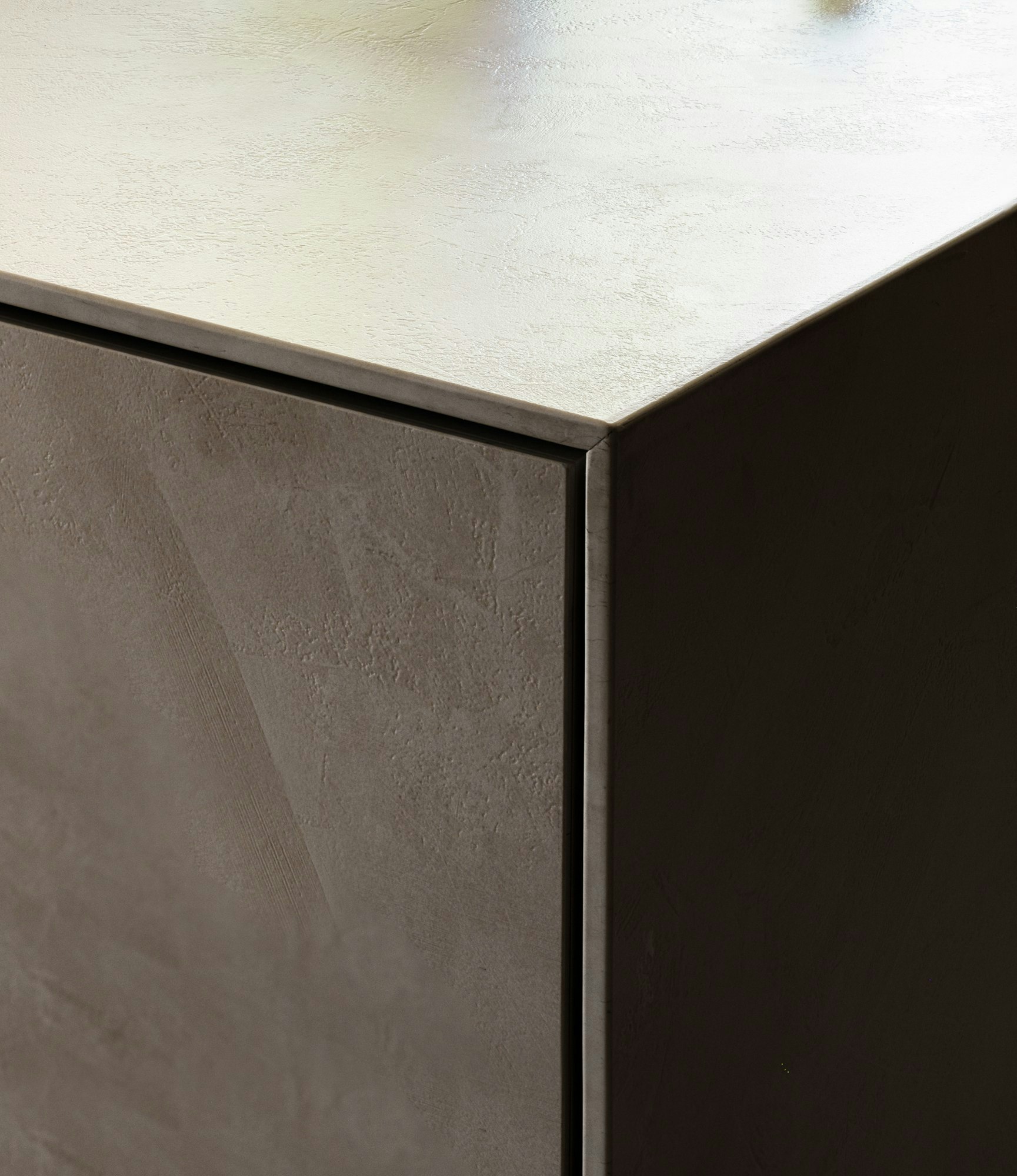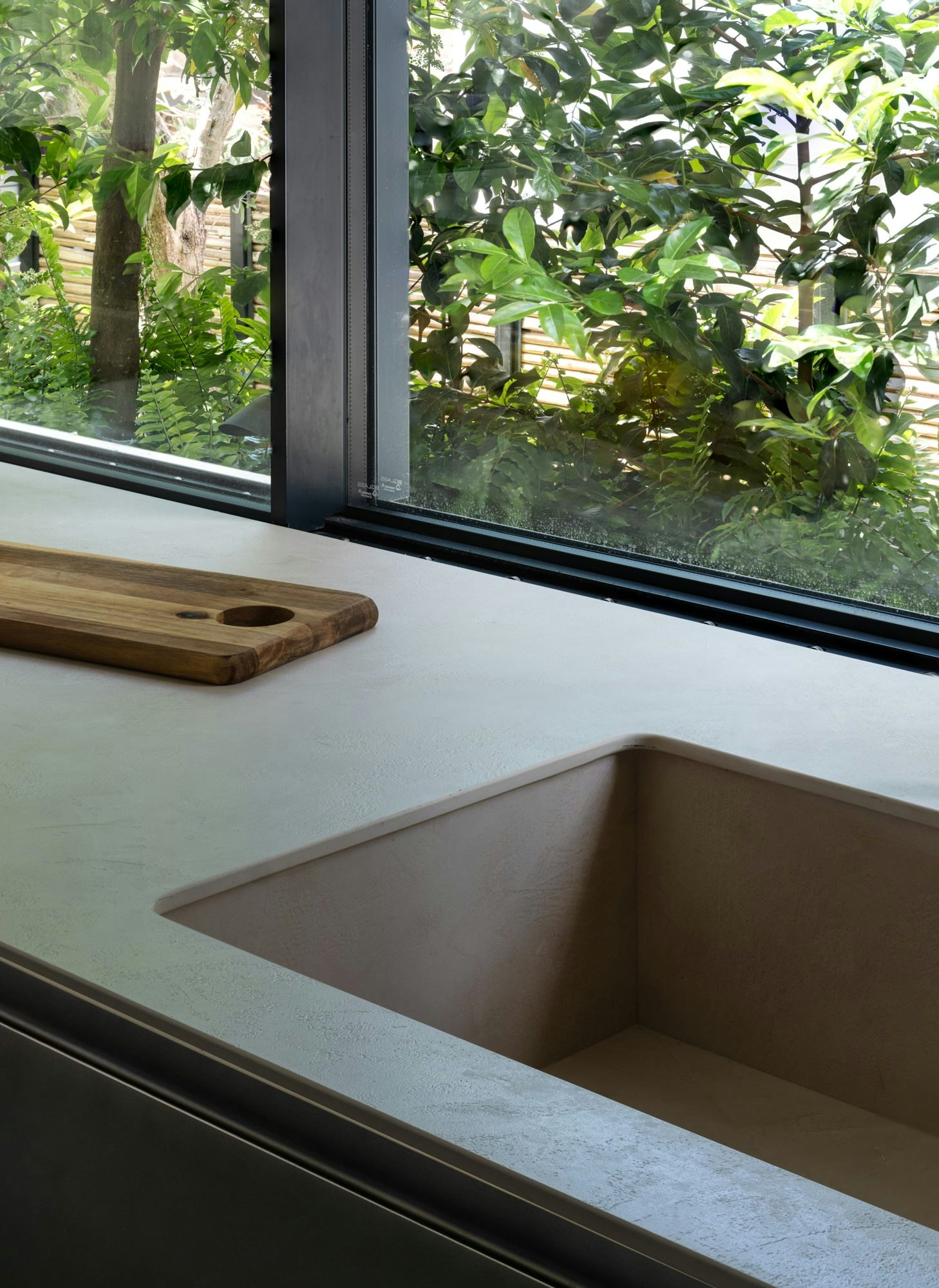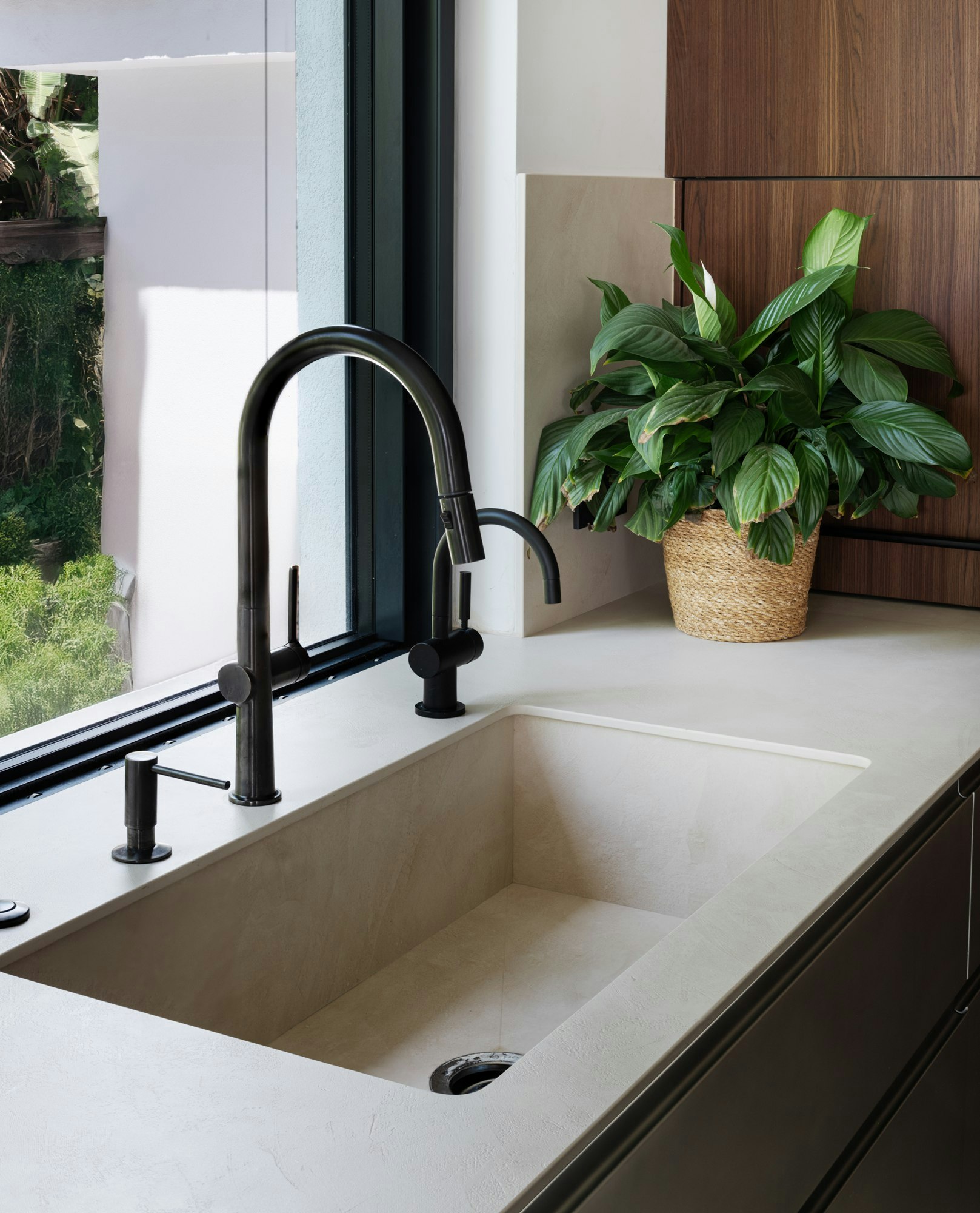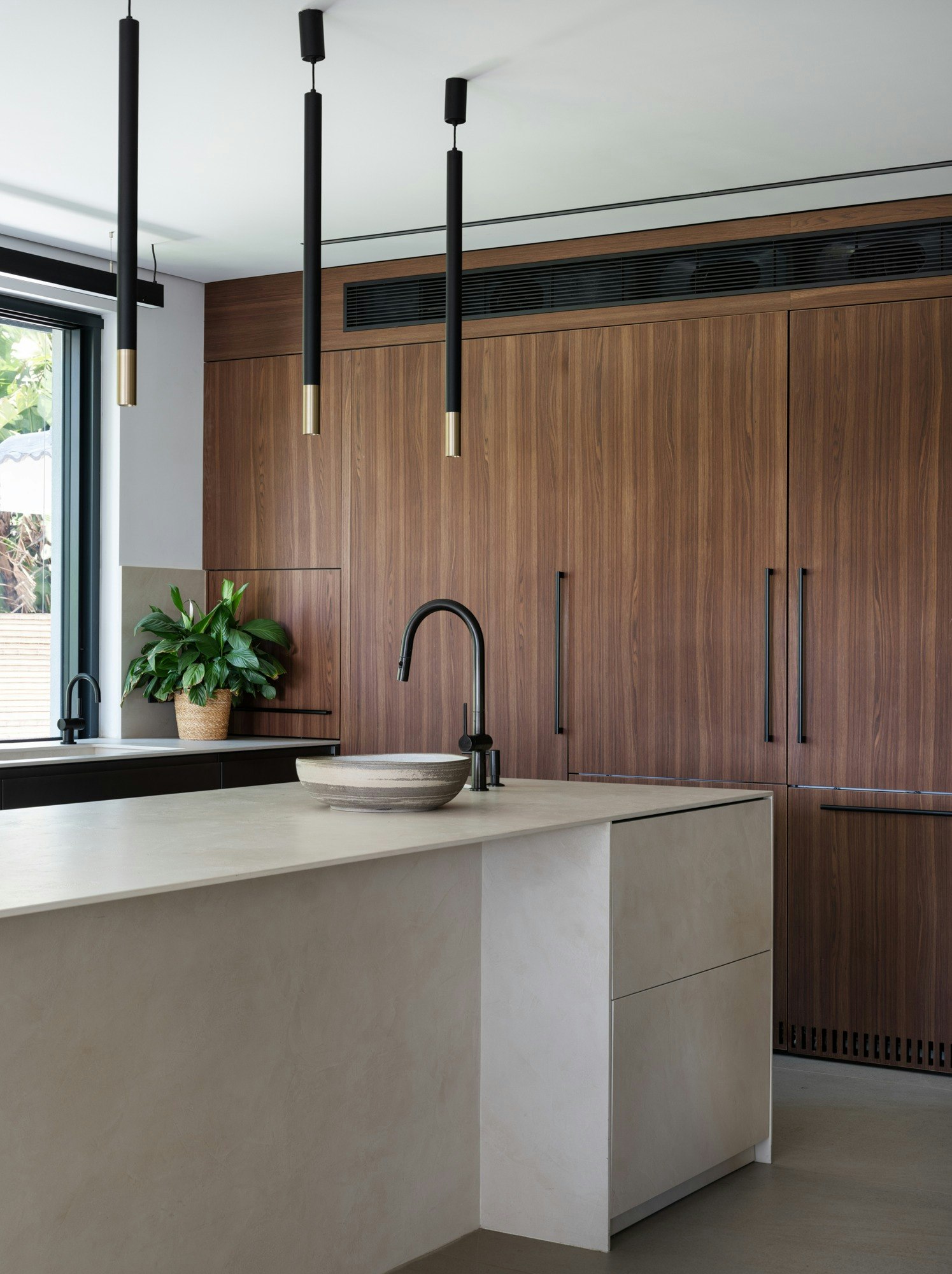 בפנים, המטבח עבר שינוי עם משטח עבודה בצורת L מ-Dekton Nacre, כולל חיפוי הארונות ורגלי האי. חומר זה נבחר בשל עמידותו, קלות הניקוי, עמידותו לשימוש יומיומי והמראה הניטרלי והאלגנטי שלו, שמתאים בדיוק לגישה "נקי, פרקטי ועל-זמני" של האדריכלית. למעשה, המוטו שלה בפרויקטים הוא לבחור משטחים שעמידים לשימוש יומיומי, מסתירים לכלוך וקלים לתחזוקה, מבלי להתפשר על העיצוב.