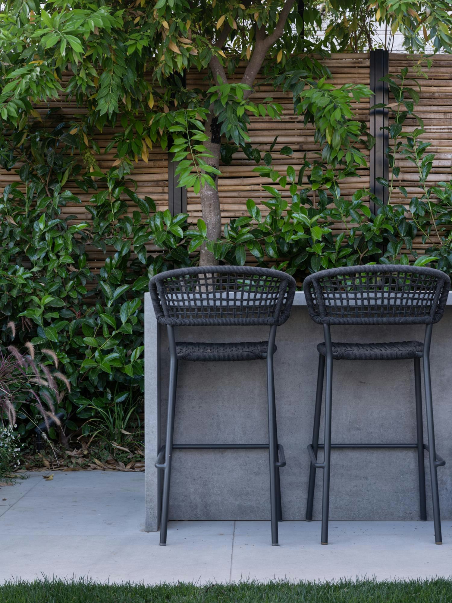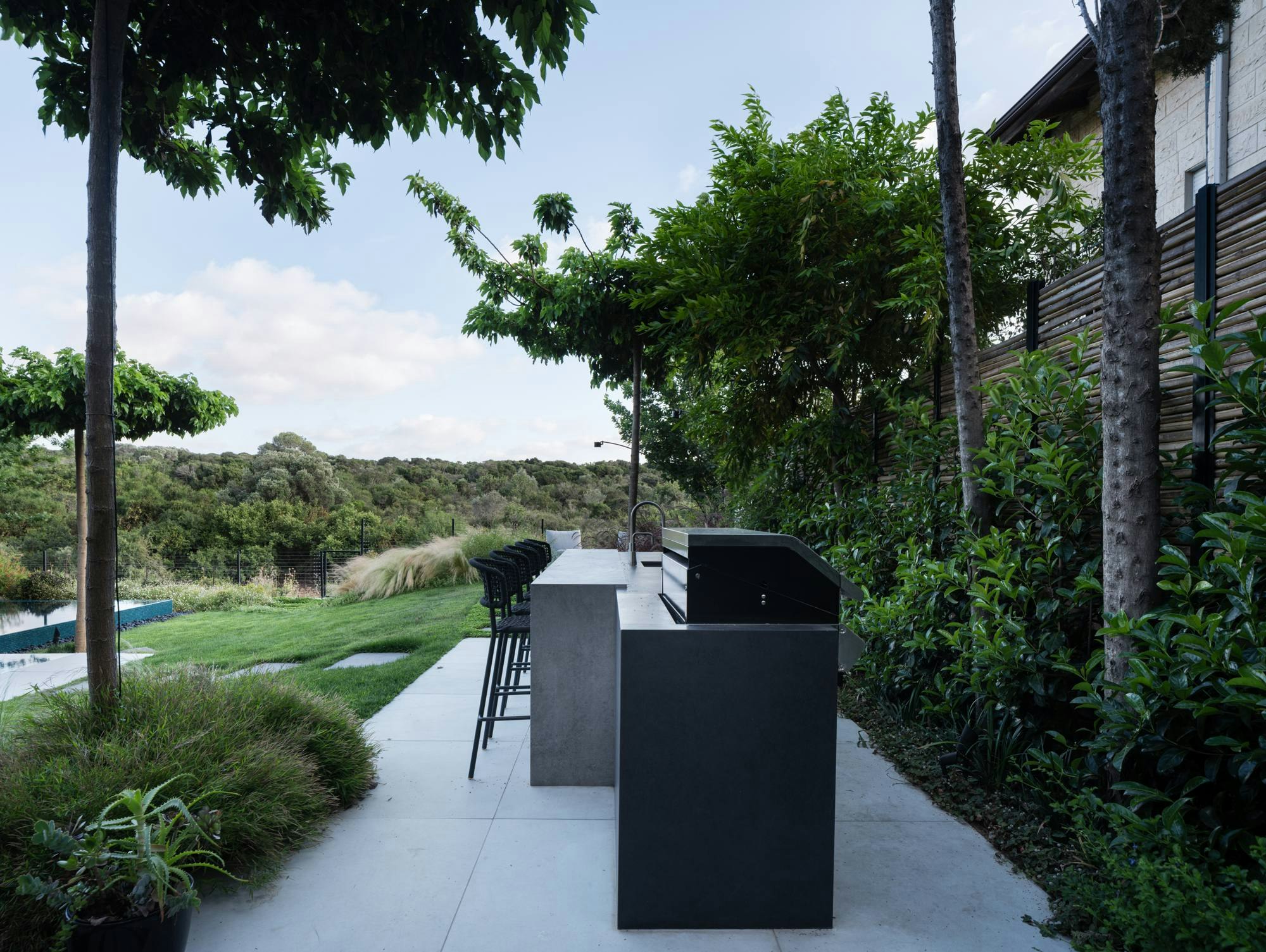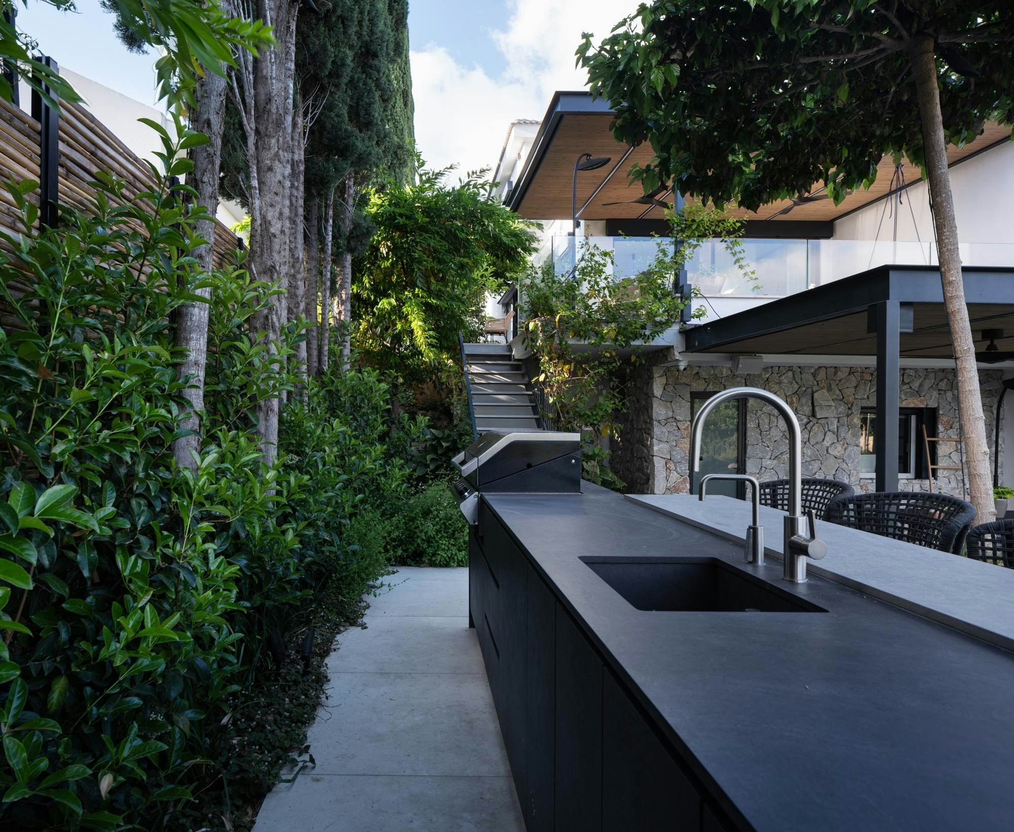 התכנון כלל גם מטבח חיצוני, המצויד במשטחי עבודה מ-Dekton Kreta ו-Dekton Eter. הגוונים האפורים של משטחים אלו משתלבים עם הצמחייה והפלטה הטבעית של הנוף, תוך הבטחת עמידות בפני פגעי מזג האוויר, חום, אבק ושימוש יומיומי, וכן תחזוקה פשוטה ויעילה.