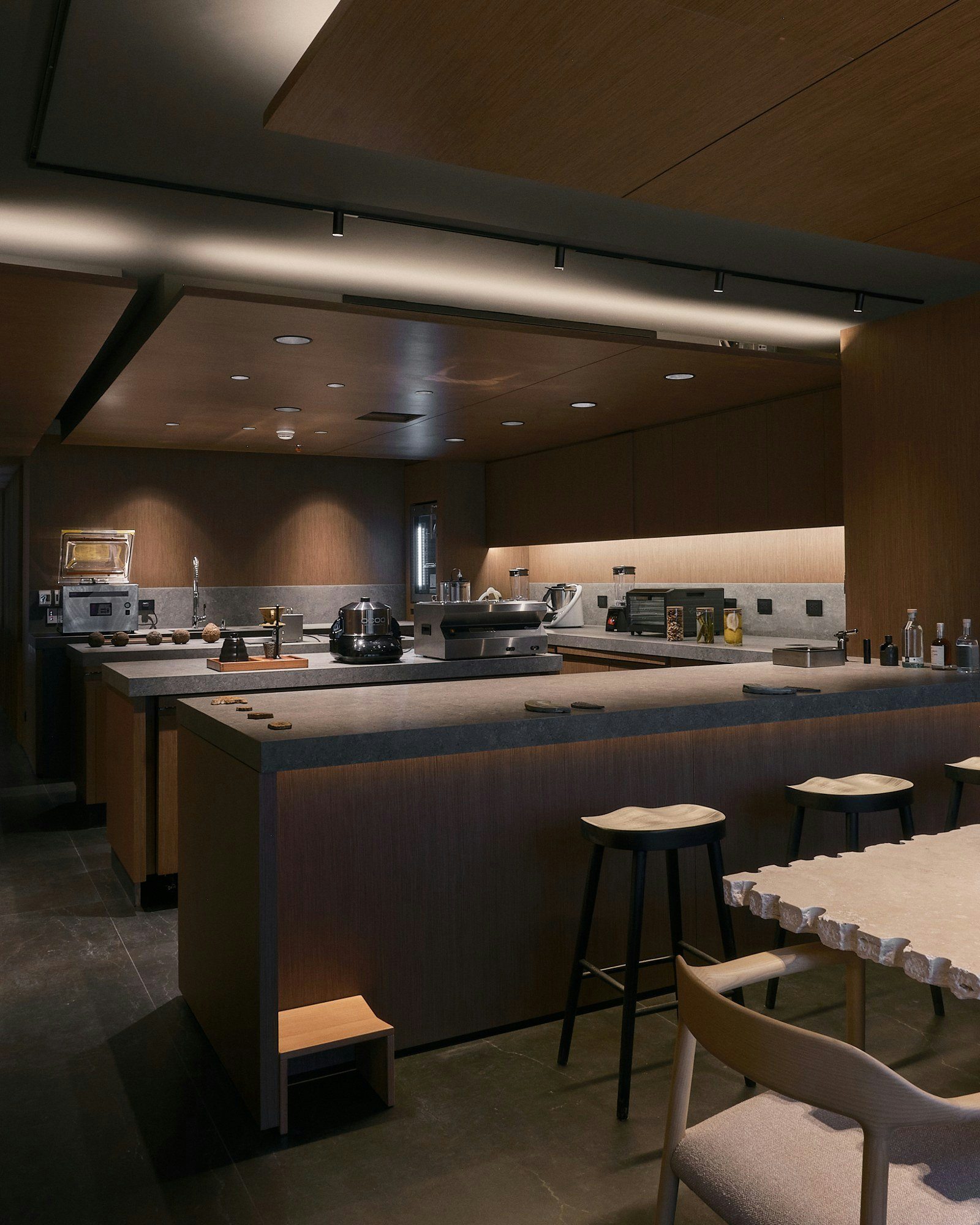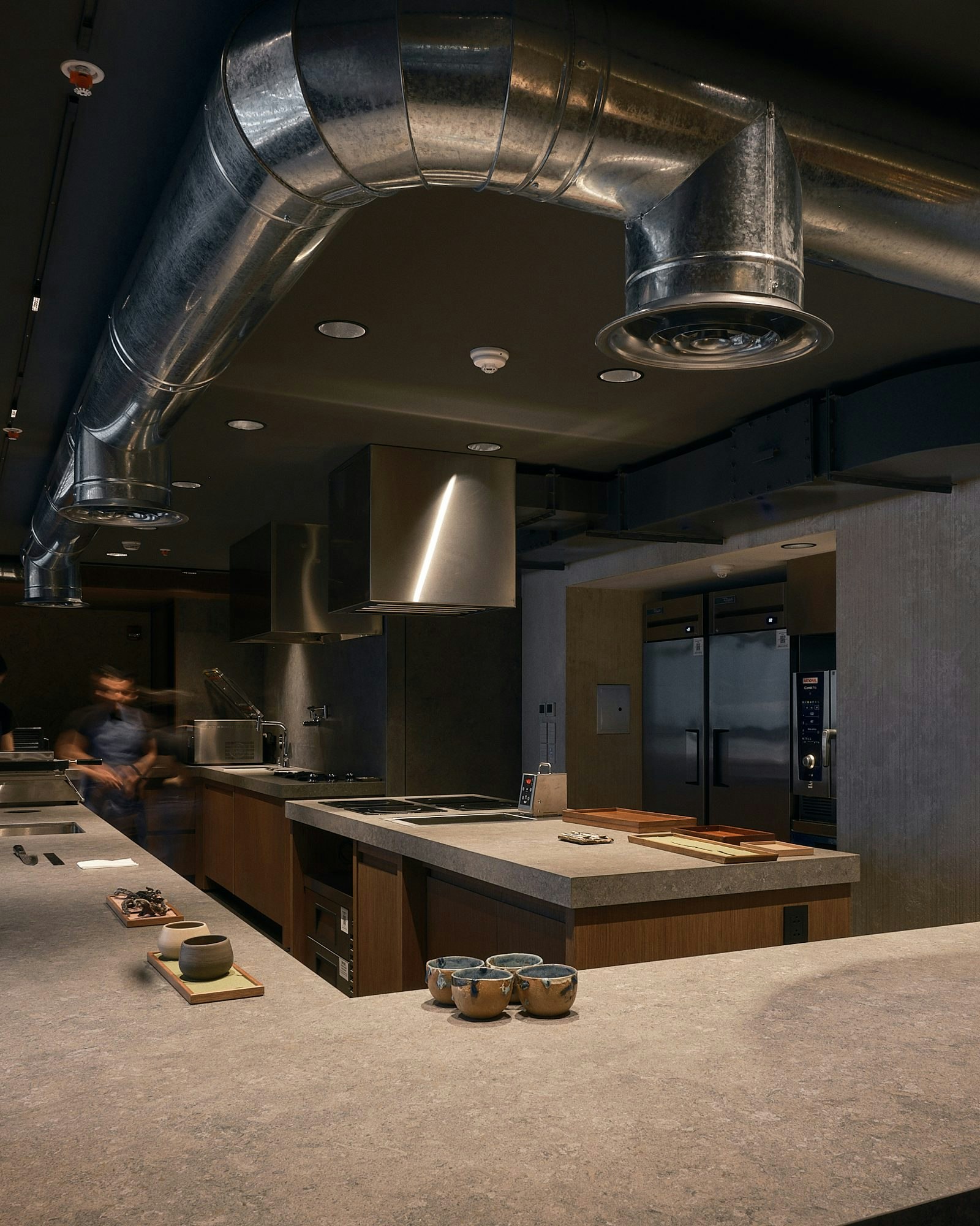 As explained by the project team, the choice of Cosentino is due to 'its technology and high-level design finishes.' This decision is particularly relevant in a demanding environment such as an open professional kitchen, where materials are exposed to heat, impacts, humidity, and constant intensive use. In this regard, Dekton surfaces offer 'guarantees that the material will not deteriorate or stain over time,' an essential condition for preserving the architectural integrity of the space in the long term.