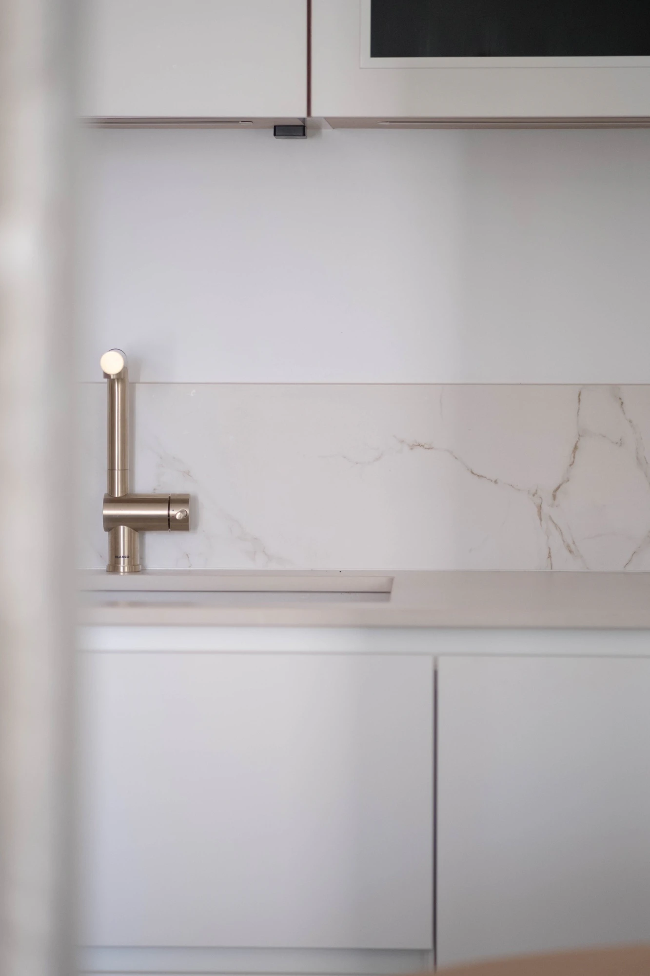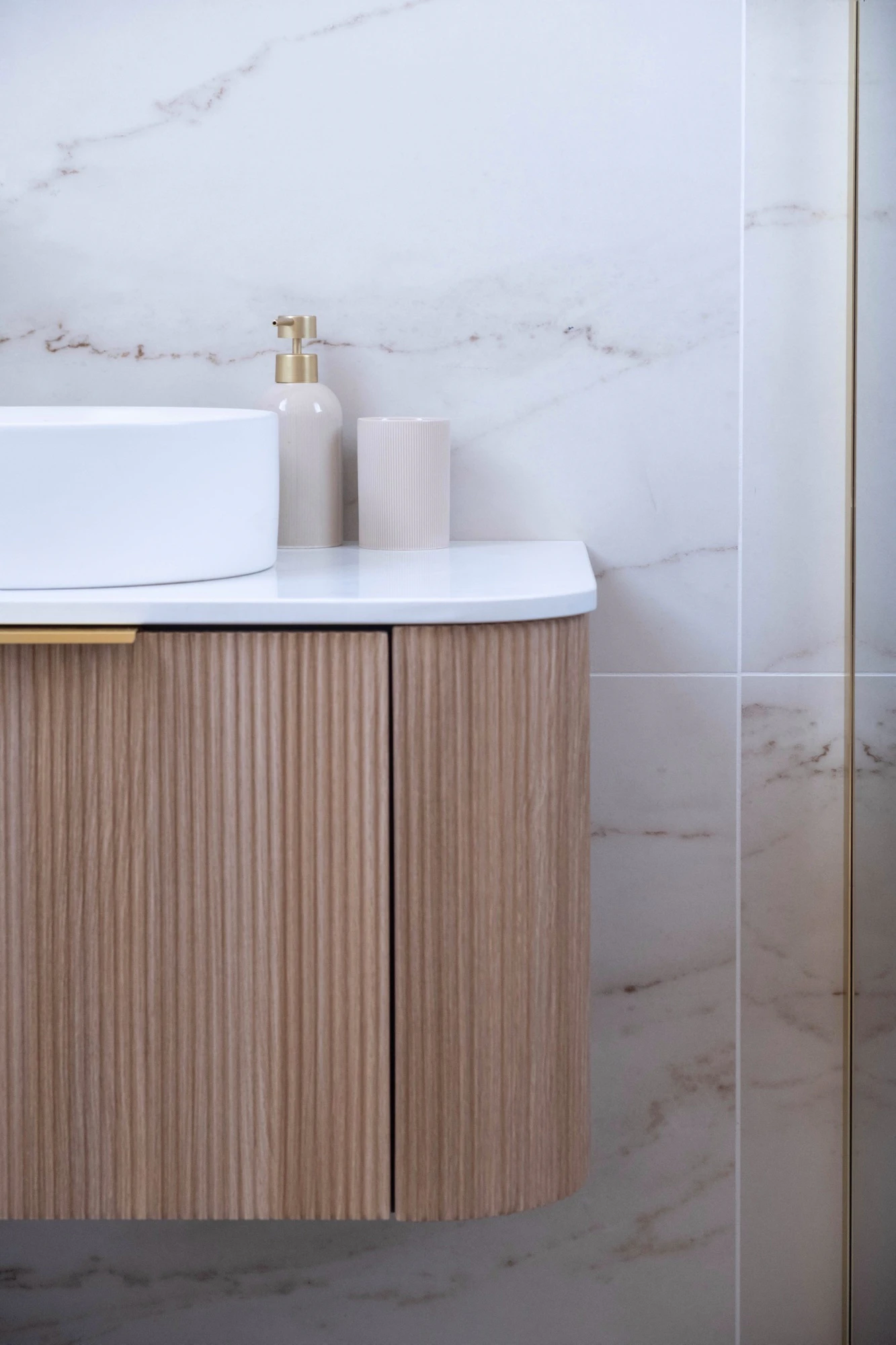 In the kitchens, Dekton Entzo stands out as the central aesthetic choice. Inspired by Calacatta marble and defined by delicate golden veining, Dekton Entzo introduces a subtle sophistication that harmonizes beautifully with the natural wood accents and crisp white cabinetry.