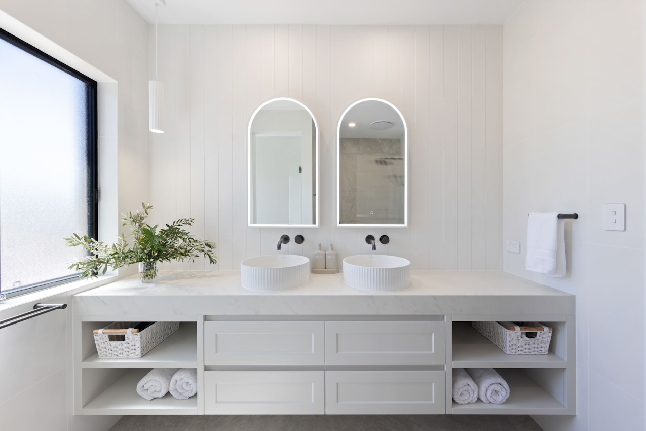 To complete the Hamptons style, we included a VJ panel feature wall and fluted glass on the frameless shower screen. Towel heaters and LED-lit mirrors add comfort and function.