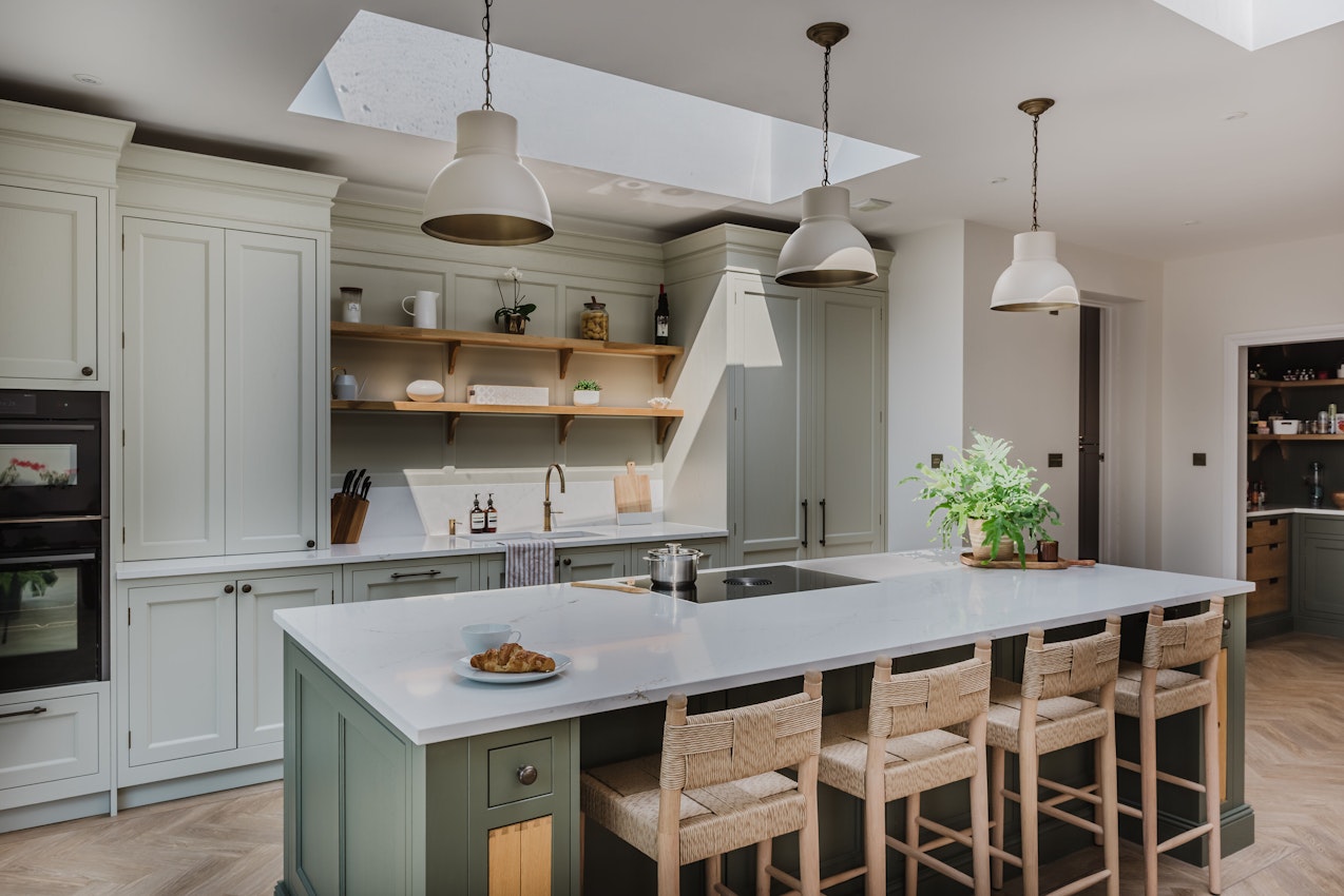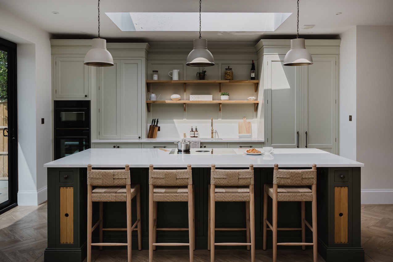 Karen’s kitchen is a beautiful mix of timeless design and considered detail, brought to life through rich materials and handcrafted touches. The surfaces are finished in elegant 30mm Silestone Ethereal Glow quartz, offering a gentle veining that lifts the space and adds lightness to the overall palette.