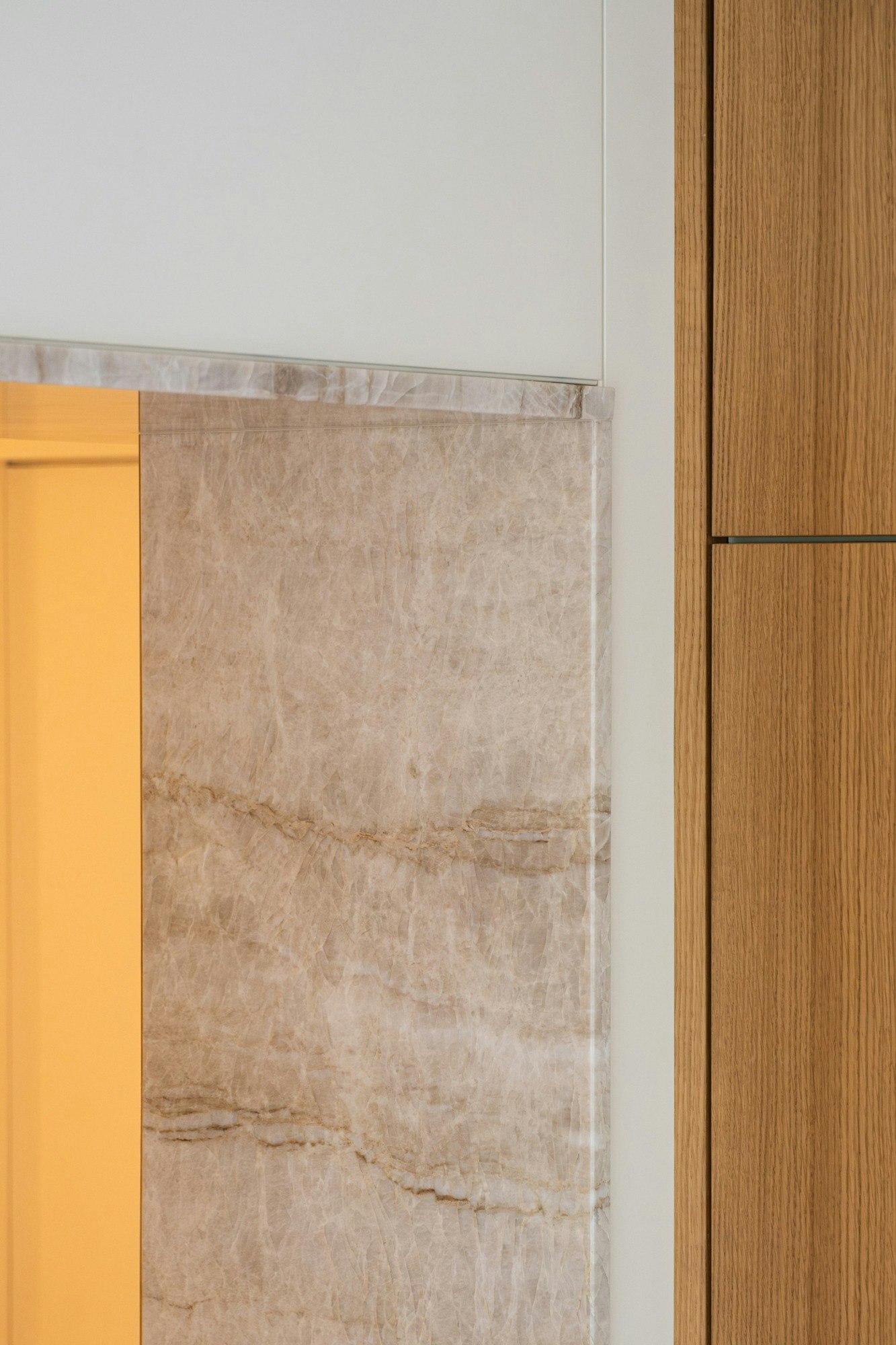 From the moment you enter, a strong architectural gesture sets the tone: a doorframe entirely clad in Sensa Taj Mahal, creating a mineral threshold that marks the transition between the entrance and the main living space. This contemporary stone surround acts as a guide, leading the eye naturally toward the heart of the apartment. Subtle and elegant, the material introduces the warm beige palette that becomes the project’s defining thread.
