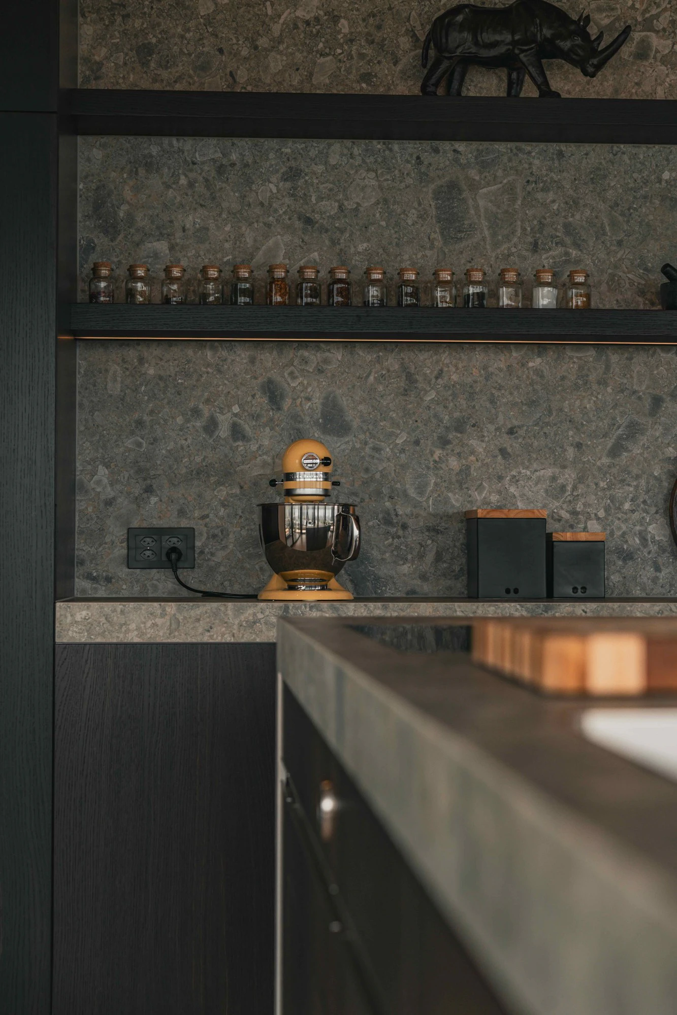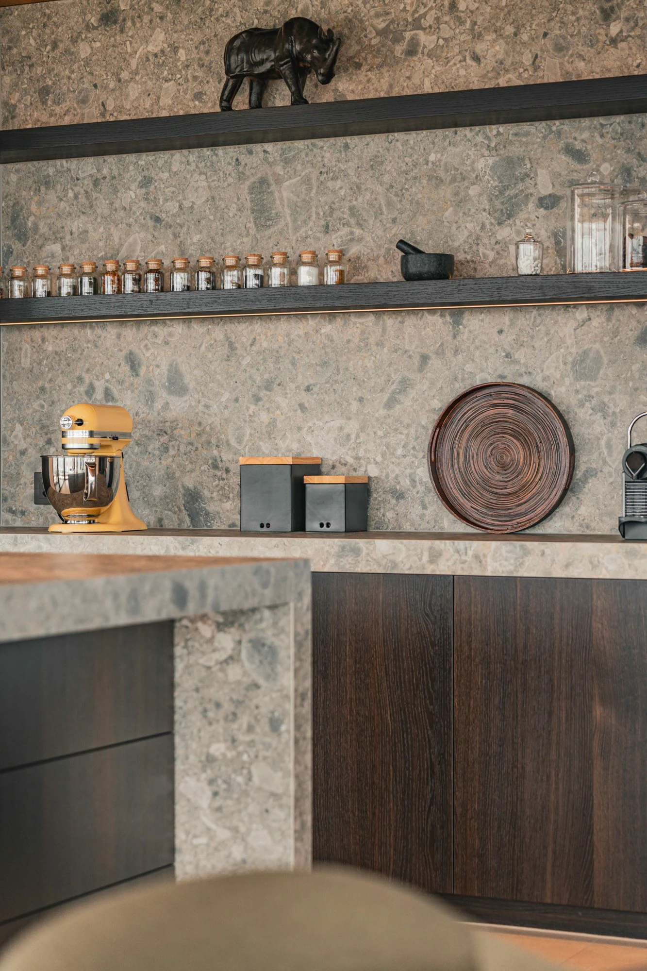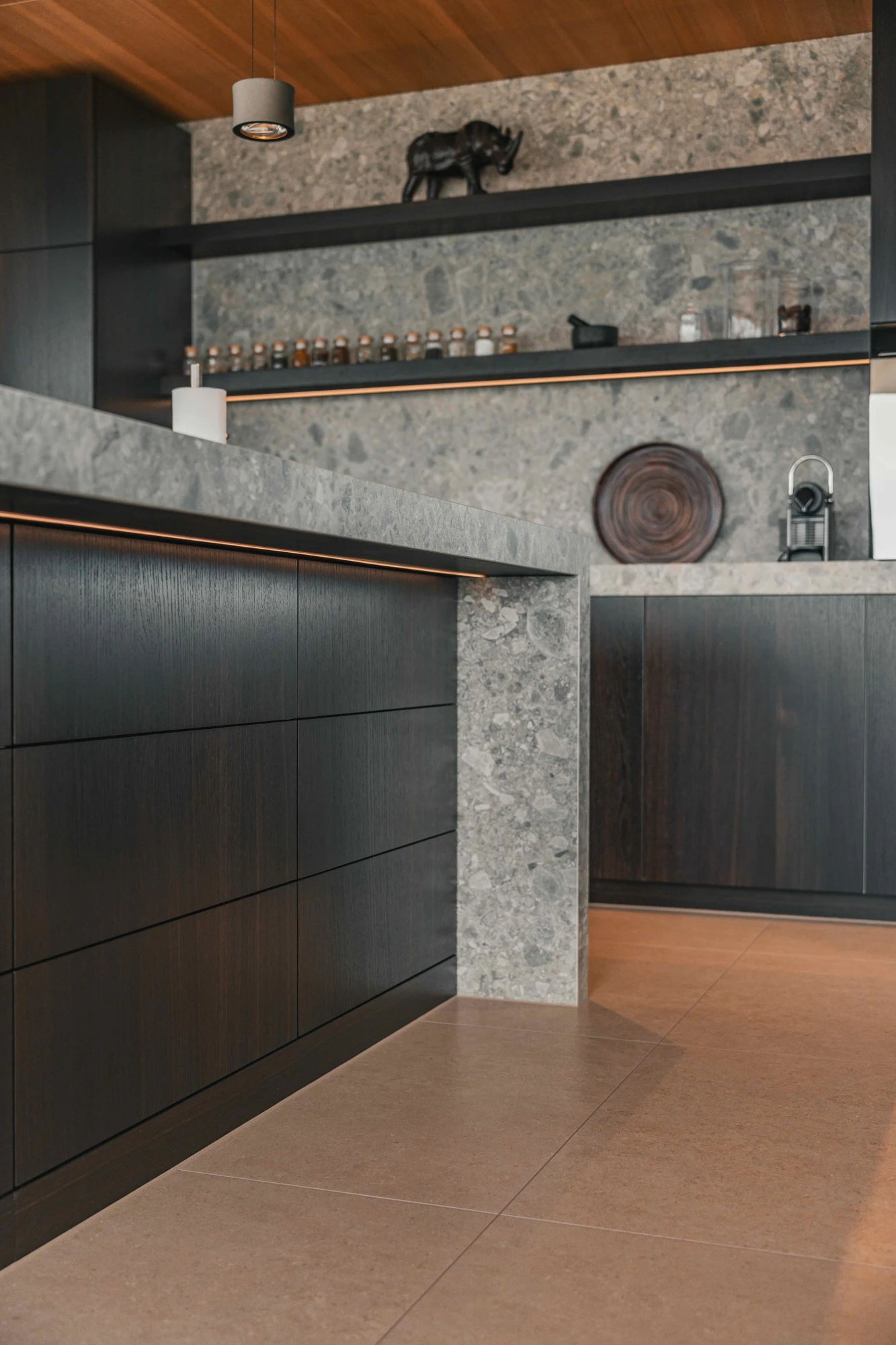 For the studio, the defining feature of the project is also the balance between strong material presence and visual restraint: “The combination of dark wood volumes with the expressive texture of Dekton Ceppo creates a clear architectural rhythm, where the kitchen island becomes a central element without dominating the space. Additionally, the continuity of materials across different surfaces enhances the sense of depth and reinforces the serene and cohesive character of the interior,” the team explains.