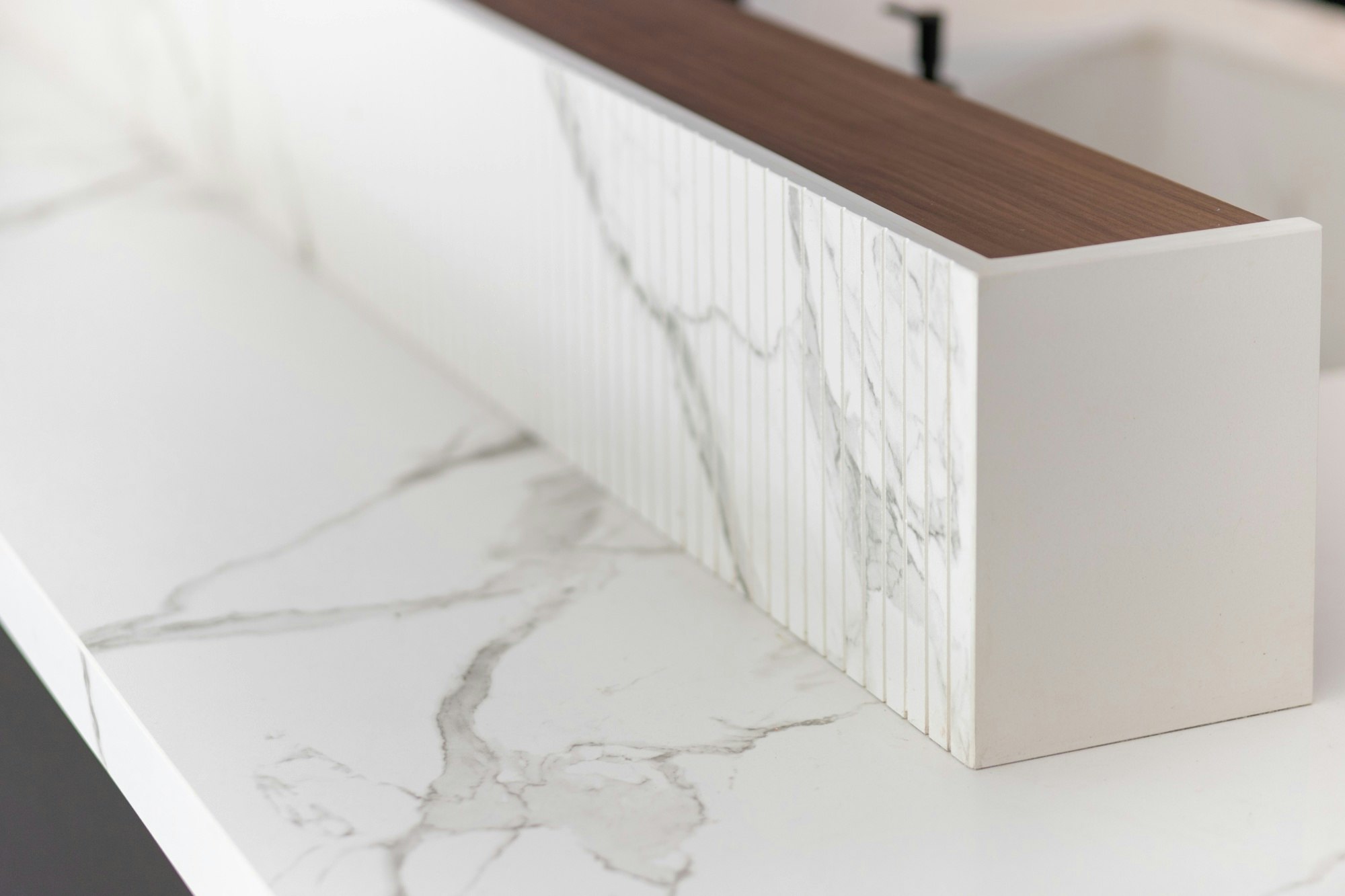 Kitchen worktops, island, wall cladding, bathroom worktops, sinks, table, screen element