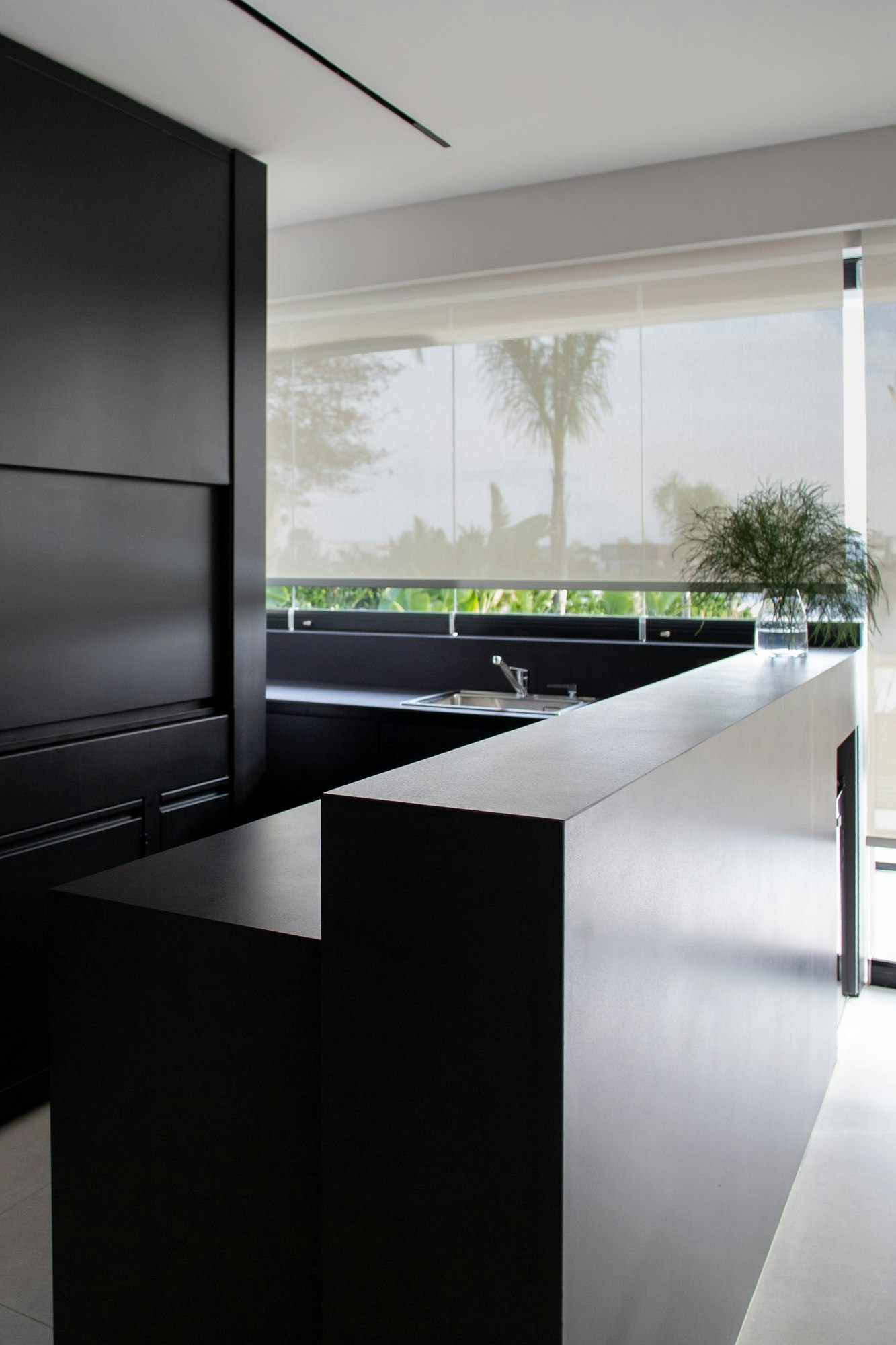 On the splashback, the same Dekton Aura is applied as cladding, extending from the worktop. The grooved design of the material, with Dekton Ukiyo Aura, introduces texture and adds rhythm to the ensemble, emphasising the purity of lines that characterises the project. It is also found on the wall cladding that houses a television. The result is a kitchen that is both functional and architectural.