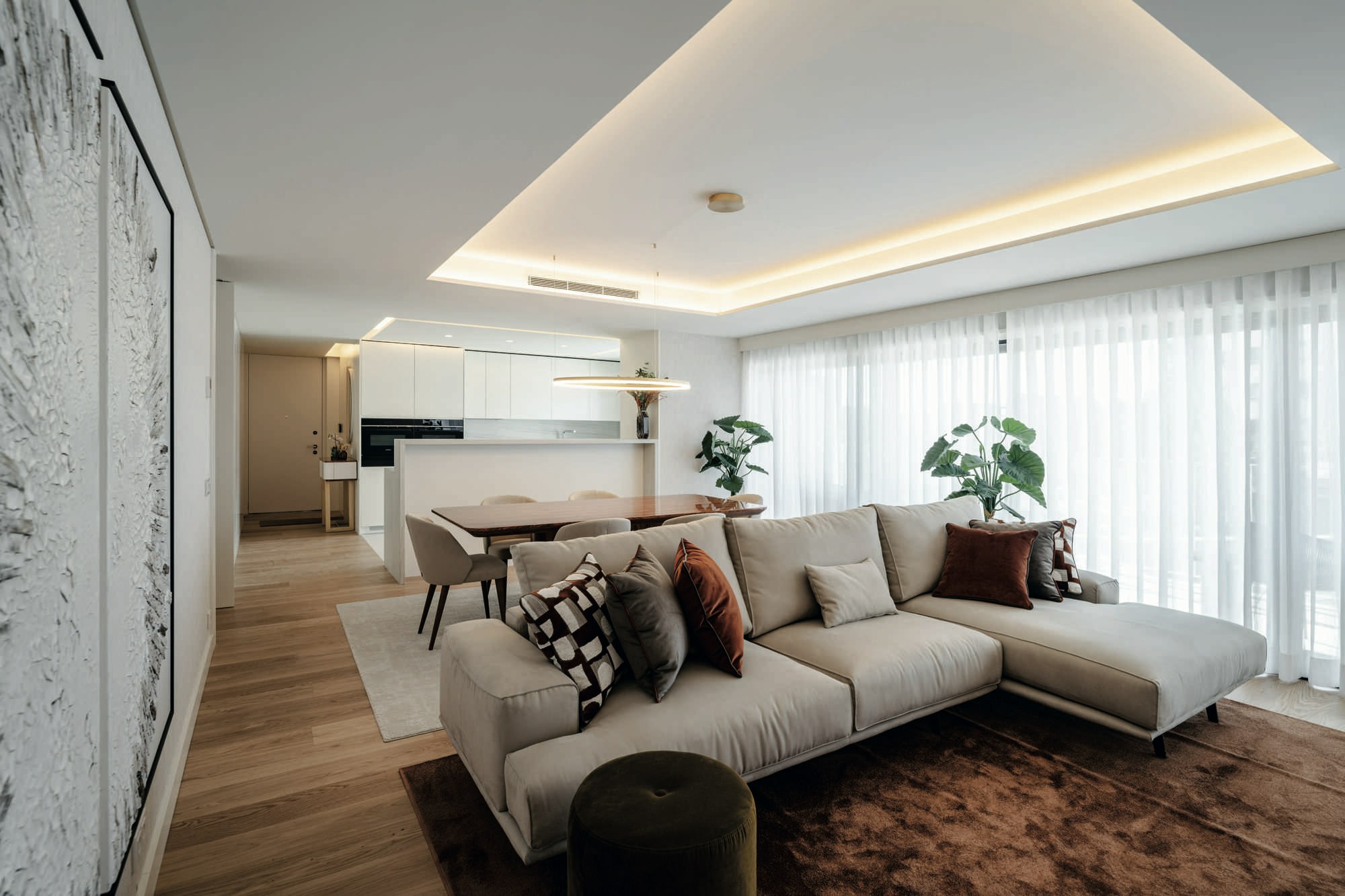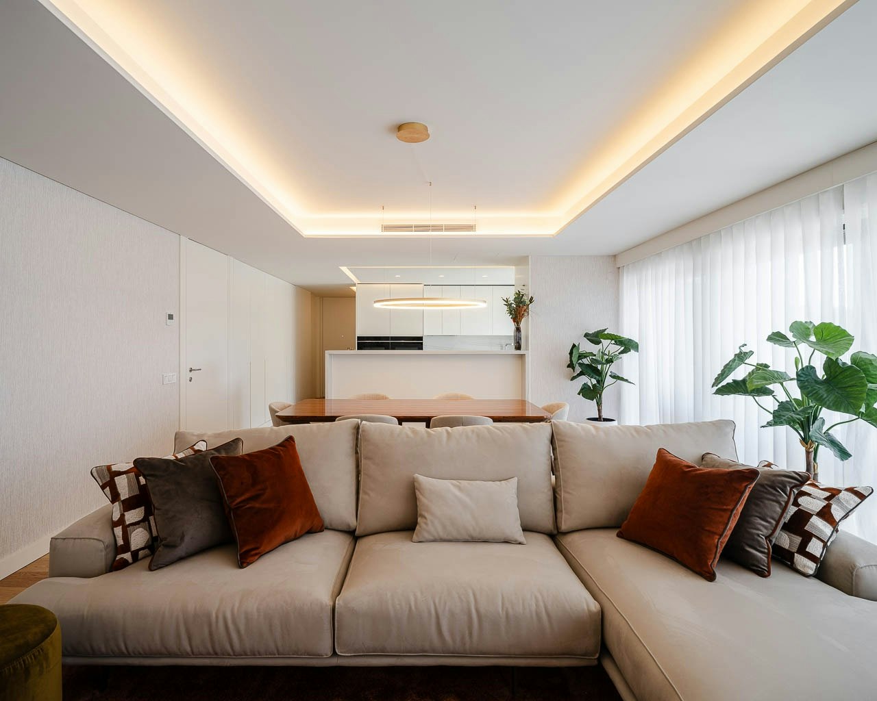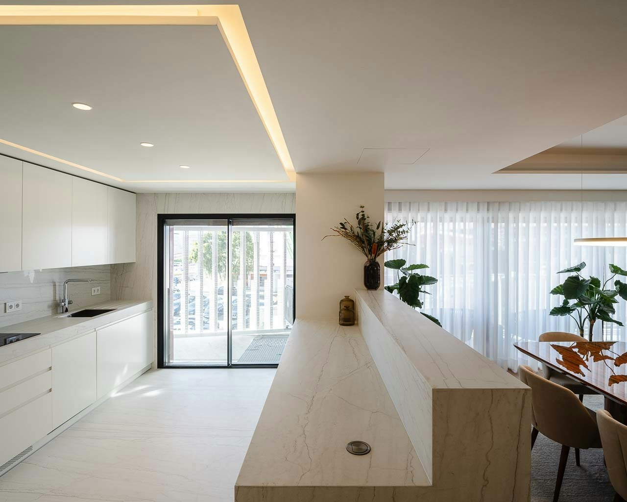 The light tone and mineral texture of the ultracompact surface Dekton Neural harmonise with the clean and precise architecture of ARX Portugal, resulting in kitchens that exude balance, functionality, and understated elegance.