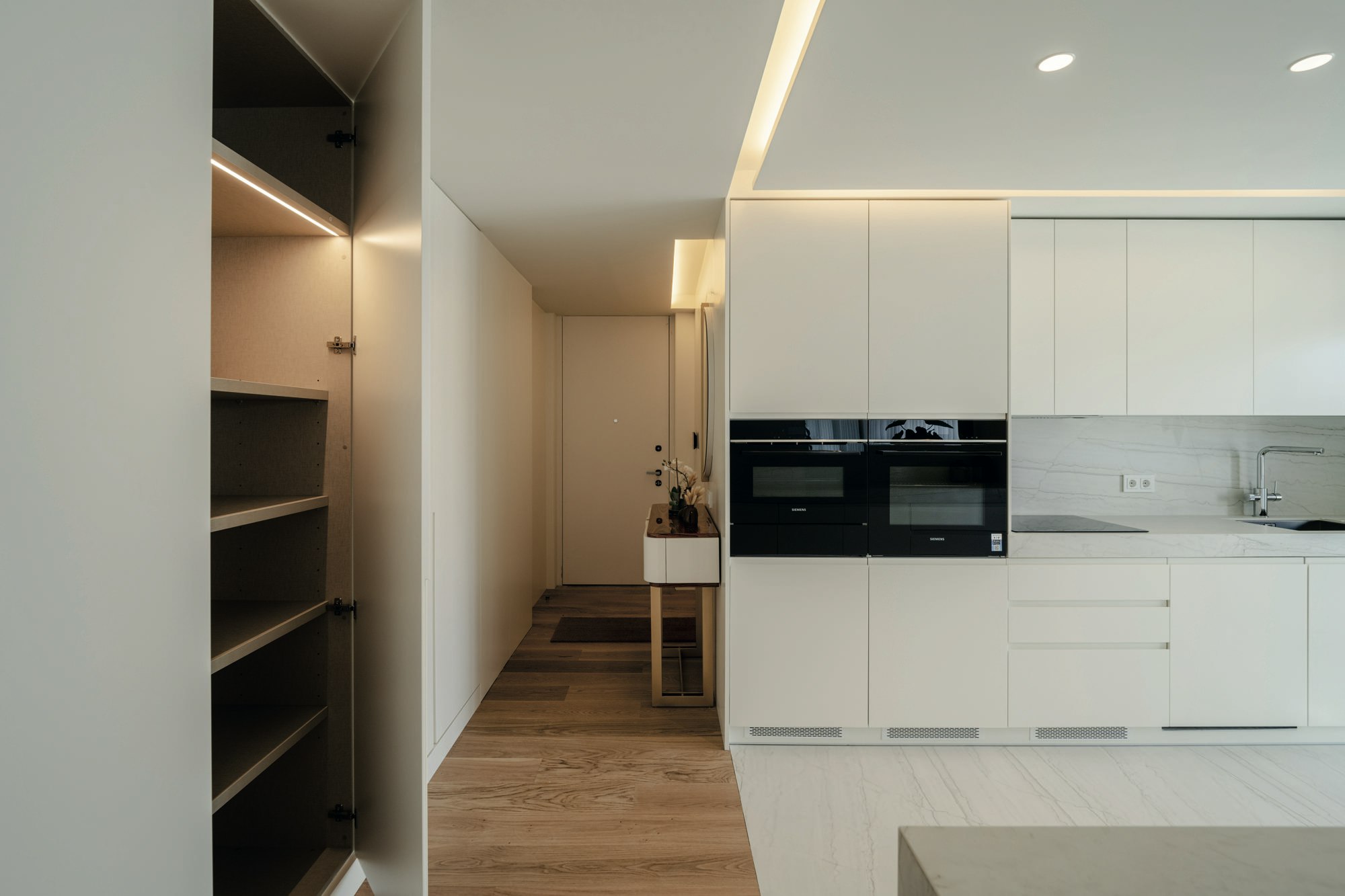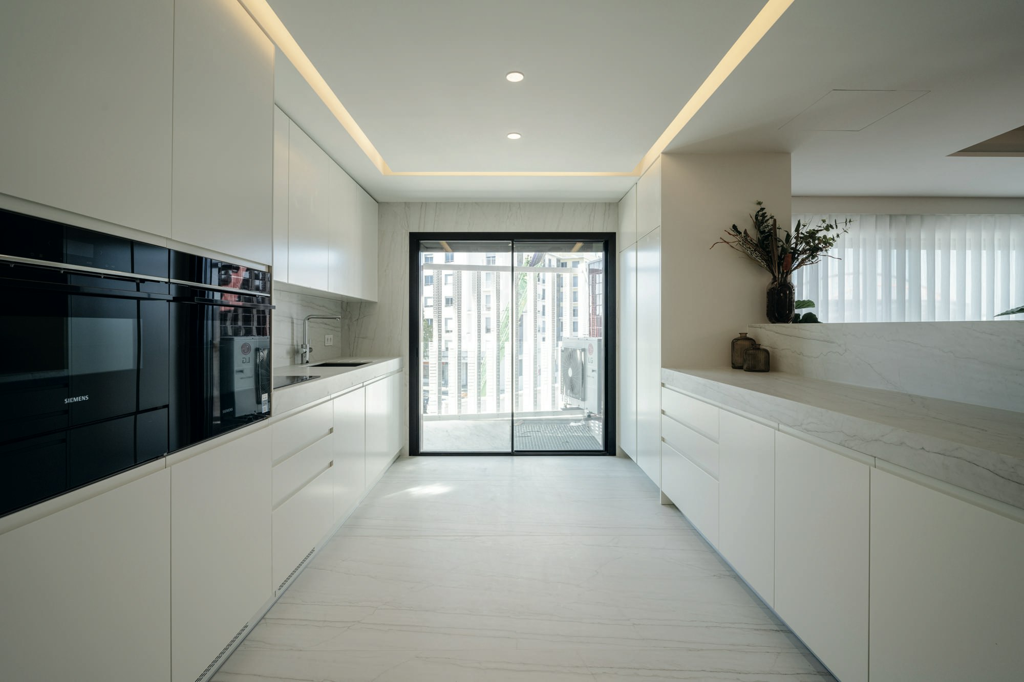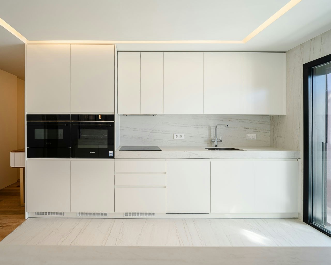 In the kitchens, the material is applied in two ways: floor and worktop, both executed in Dekton Neural. The 450 metres installed, with thicknesses of 8 mm for the floor and 12 mm for the worktops, demonstrate the technical versatility of the material. The formats allowed for continuous execution without visual interruptions, which is key in a project where the purity of lines is part of the architectural language.