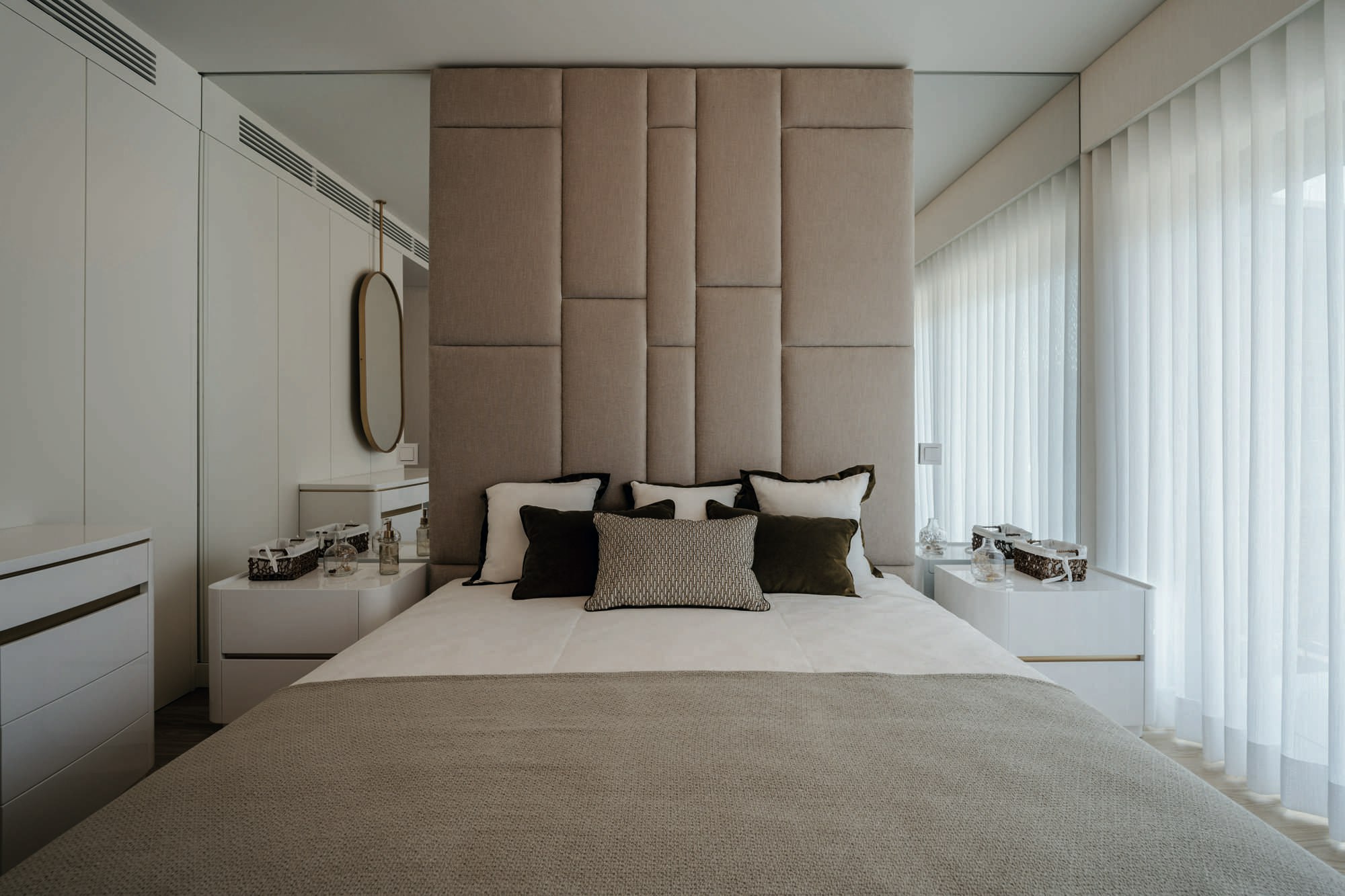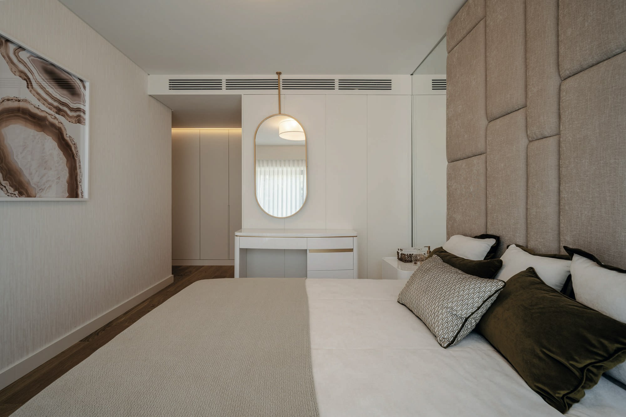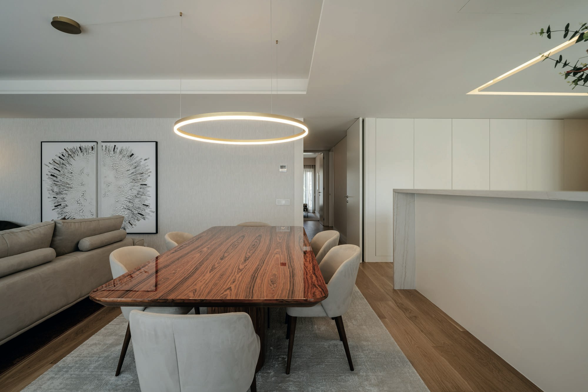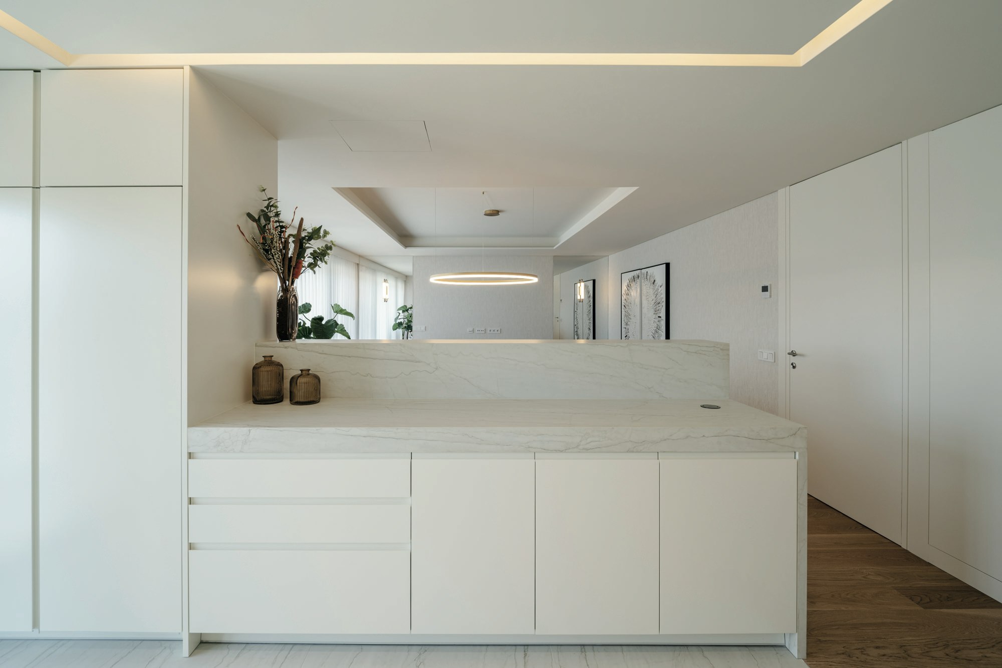 In the kitchens, the material is applied in two ways: floor and worktop, both executed in Dekton Neural. The 450 metres installed, with thicknesses of 8 mm for the floor and 12 mm for the worktops, demonstrate the technical versatility of the material. The formats allowed for continuous execution without visual interruptions, which is key in a project where the purity of lines is part of the architectural language.