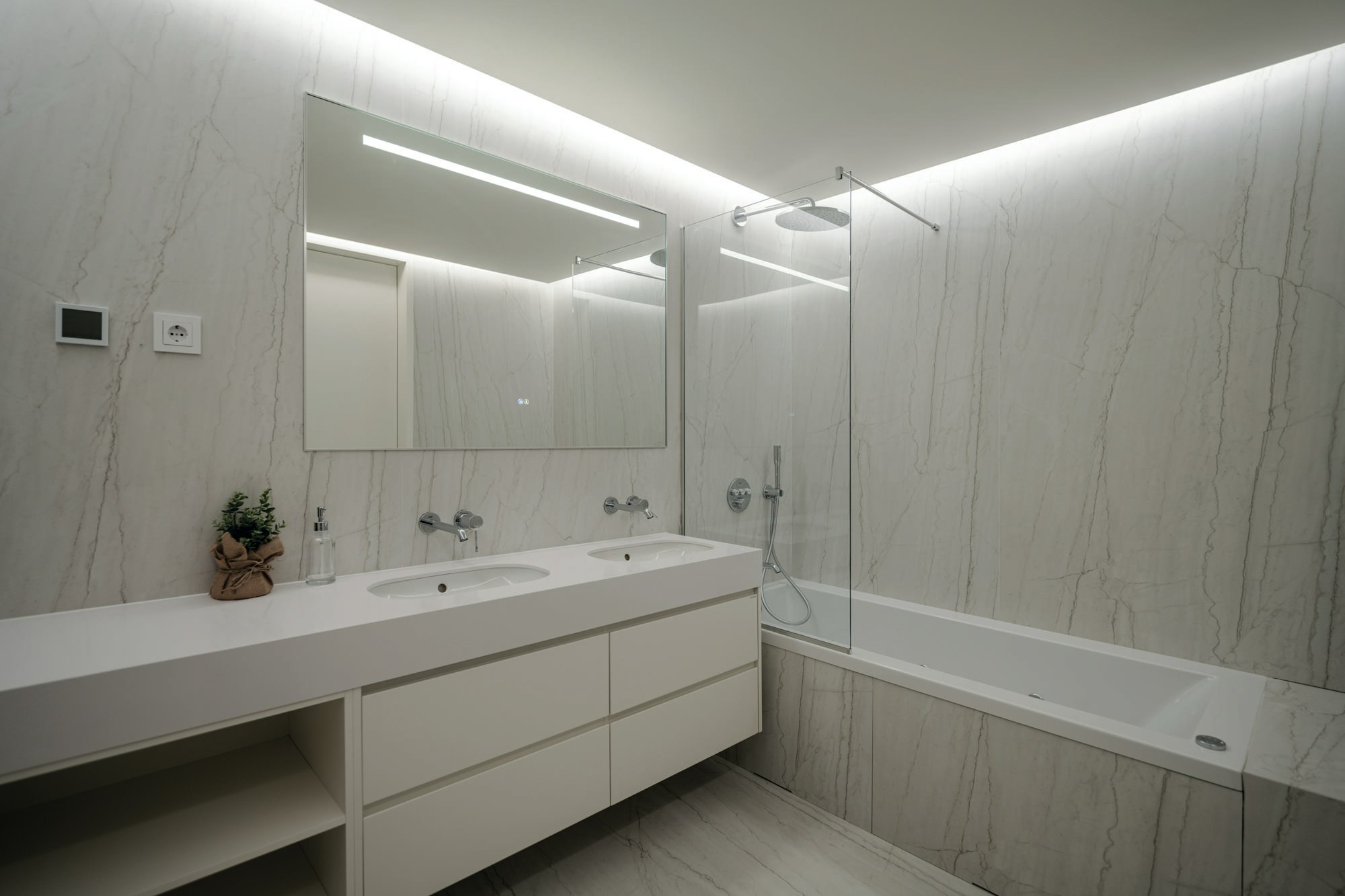 This idea —working the surface as if it were contained geology— translates into a visually understated, tactile, and timeless result. In each bathroom, Dekton Neural and Silestone Blanco Zeus provide that subtle texture that suggests nature without imitating it, with a homogeneous finish and luminosity that enhances the sense of space.