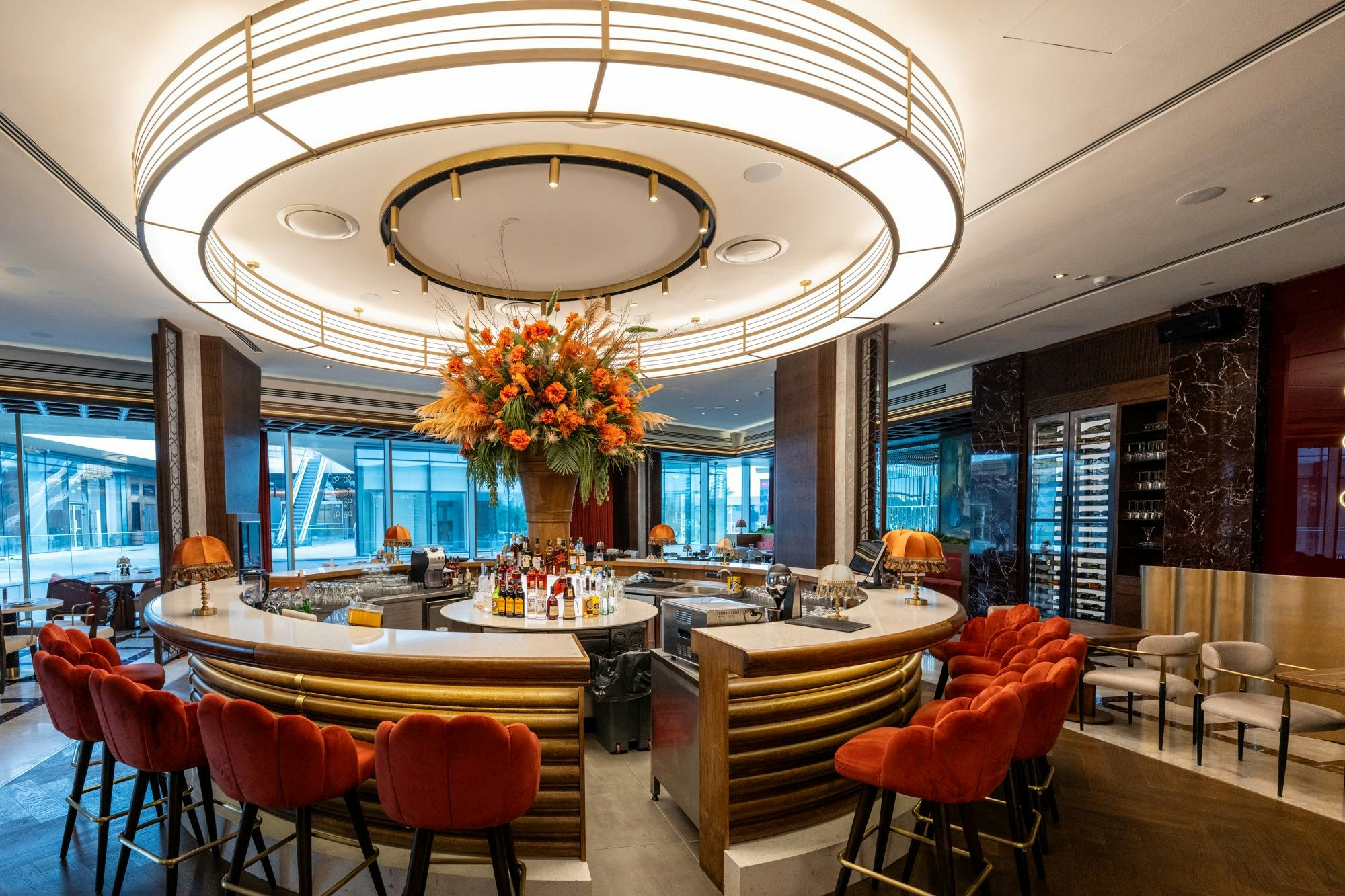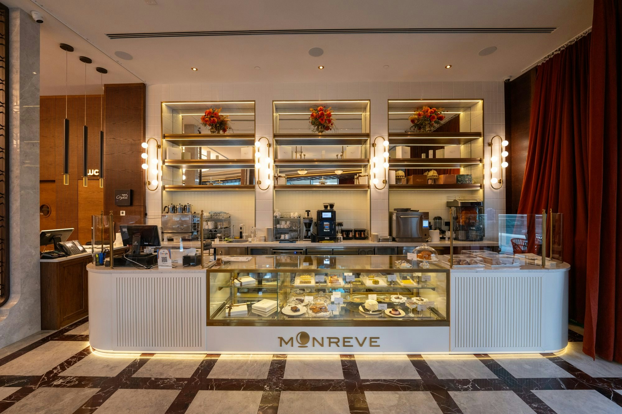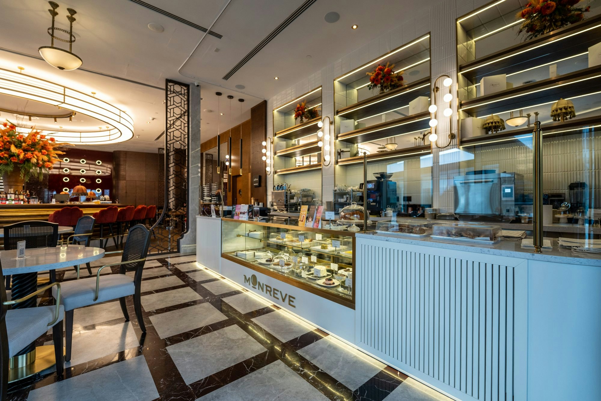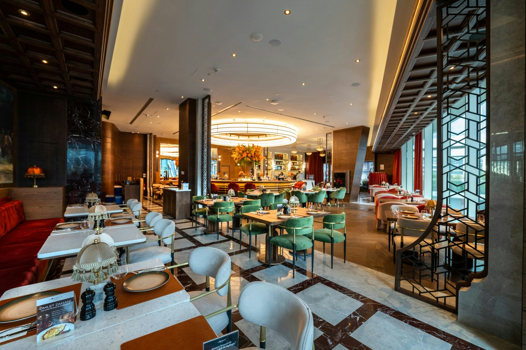 The design of Monreve Brasserie achieves a precise balance between the historical and the contemporary. Marble provides a noble and structured foundation; brass introduces warm and sophisticated reflections; and wood envelops the ensemble in a sense of timeless comfort.