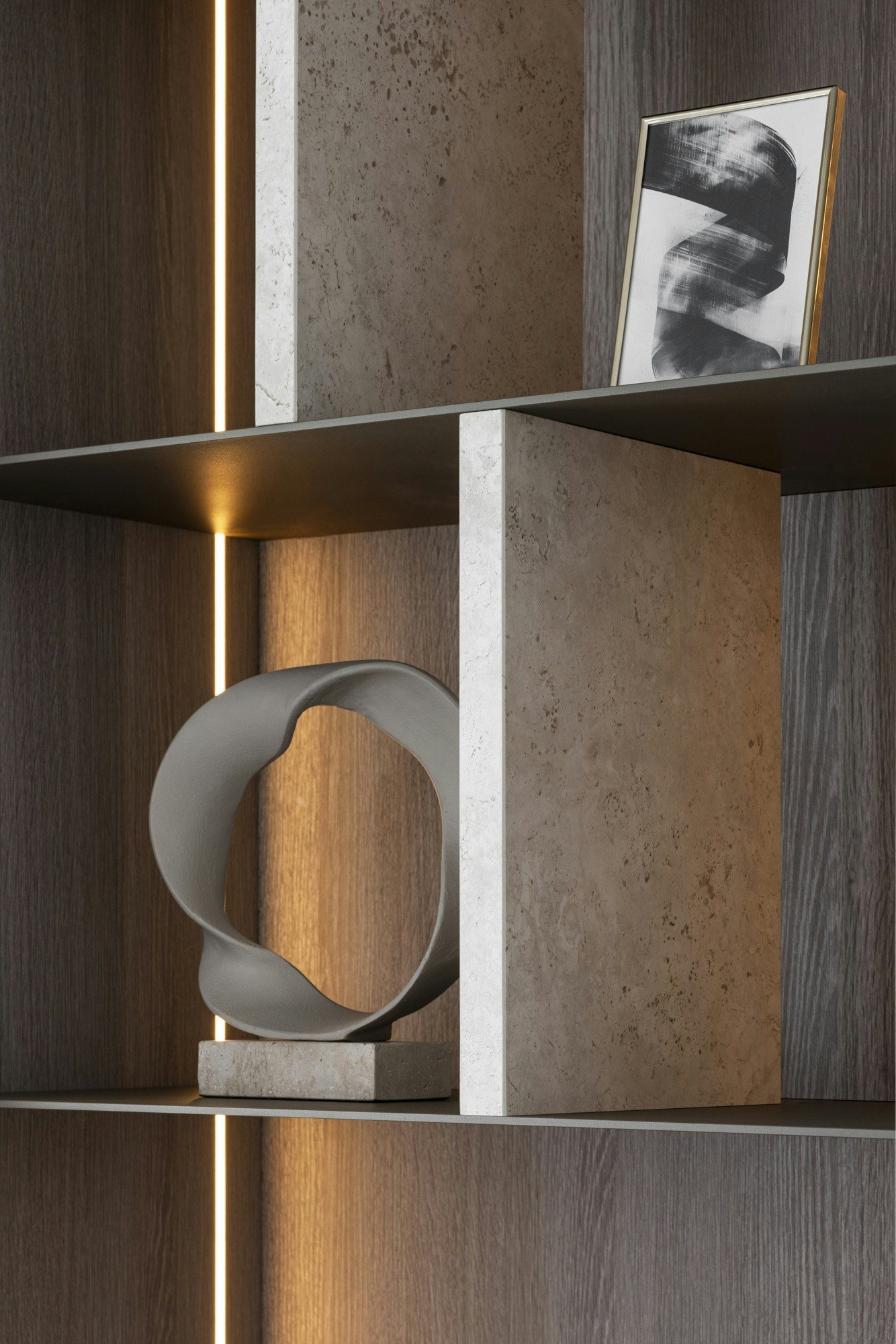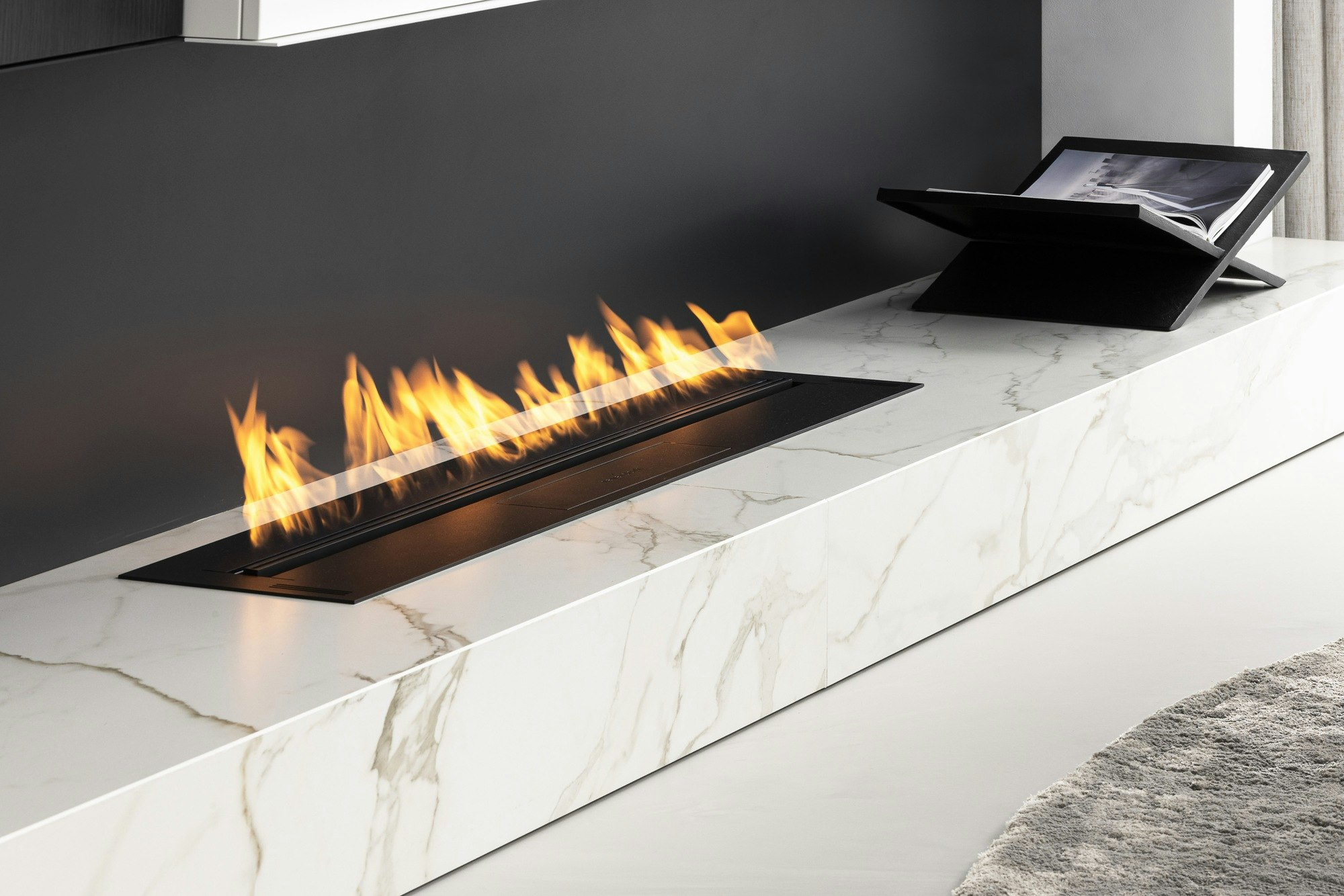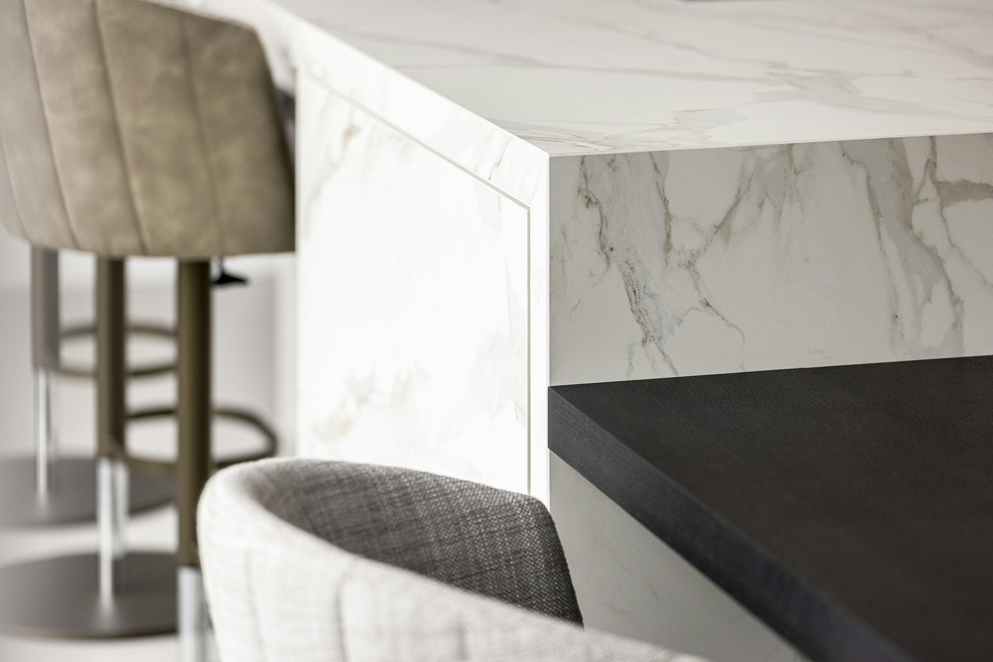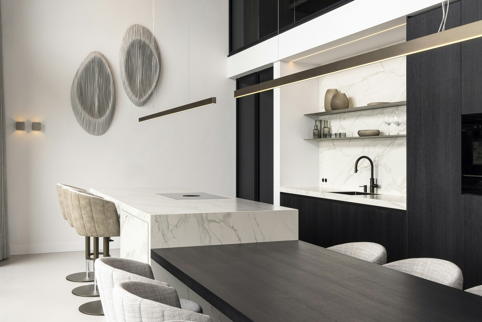 In de keuken is gekozen voor Dekton Morpheus, vanwege de marmerachtige aders die spanning en karakter toevoegen aan het strakke ontwerp. Het materiaal biedt de elegante uitstraling van marmer, maar met alle praktische voordelen die in een keuken essentieel zijn. Hetzelfde Dekton is doorgetrokken rond de open haard, waar de hittebestendigheid opnieuw bijdraagt aan een sterk en stijlvol geheel.