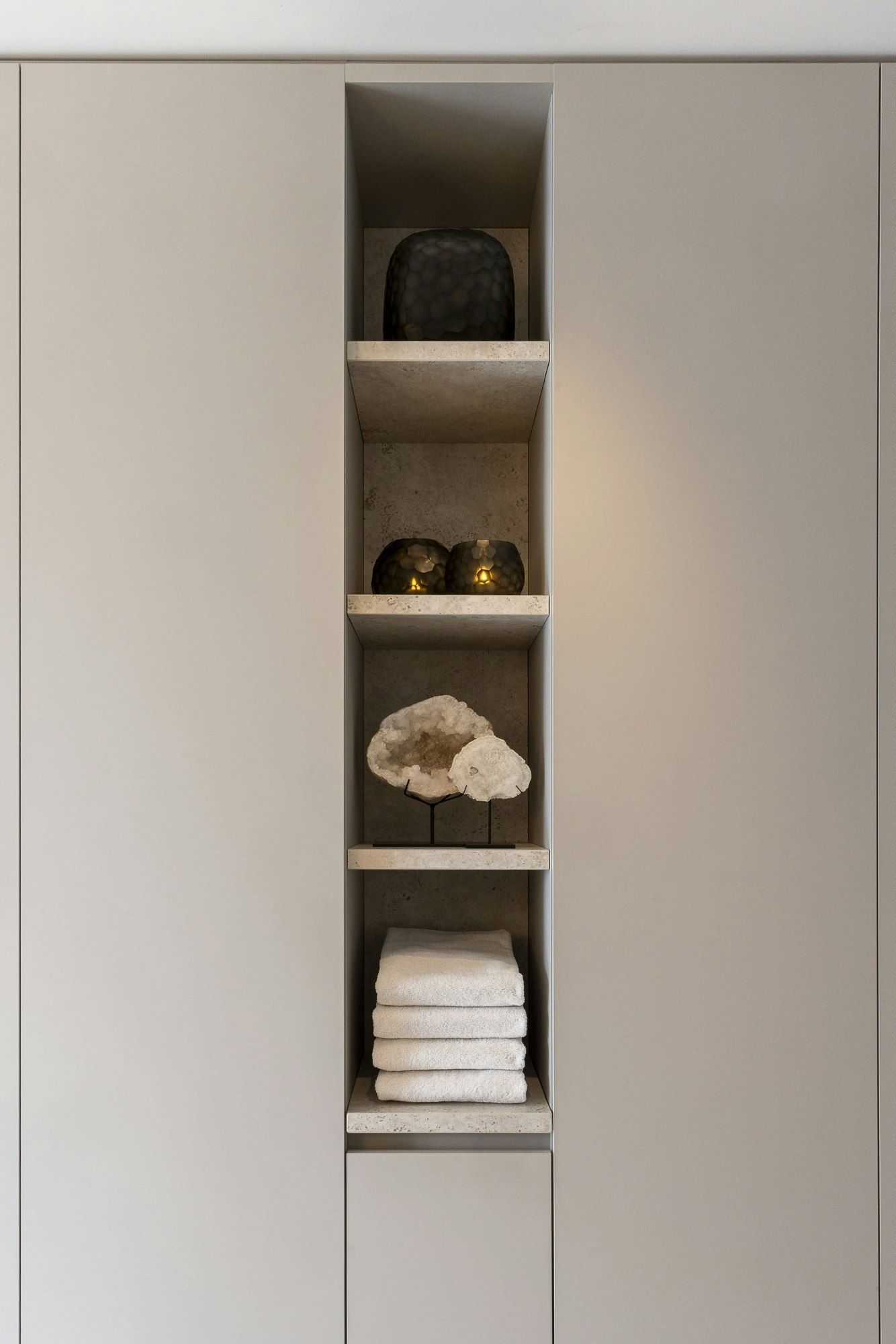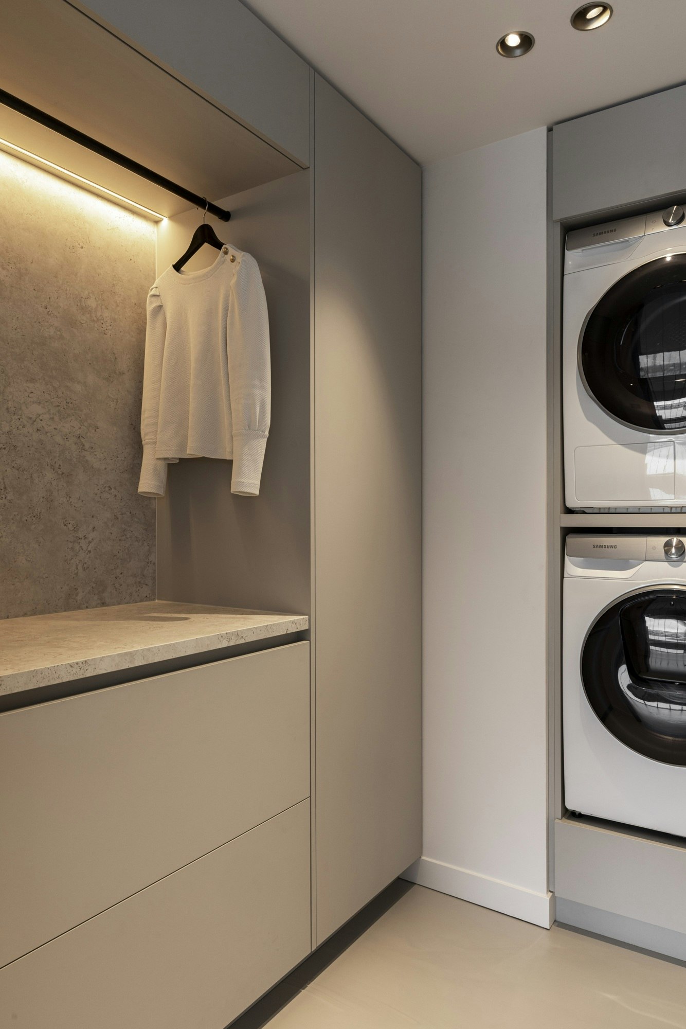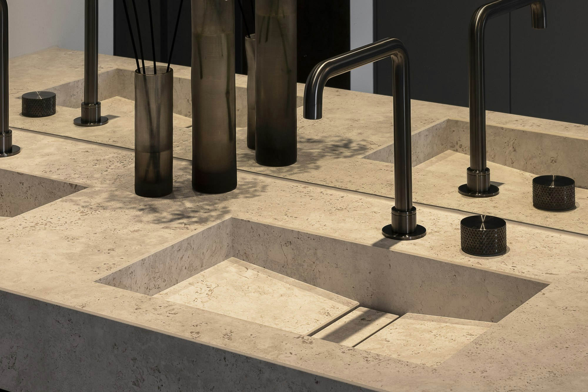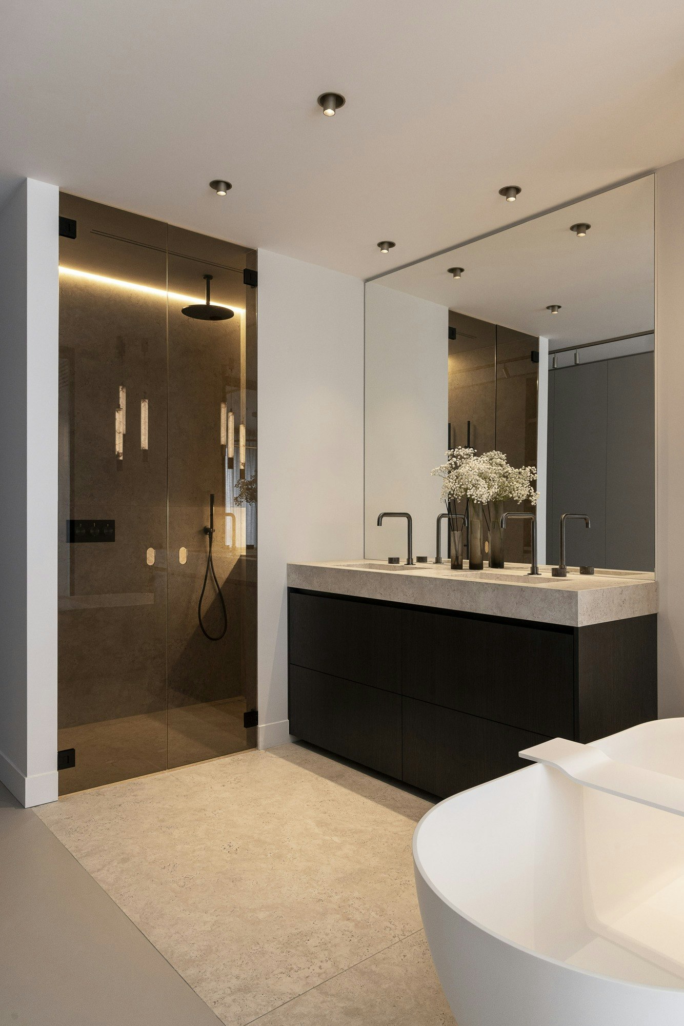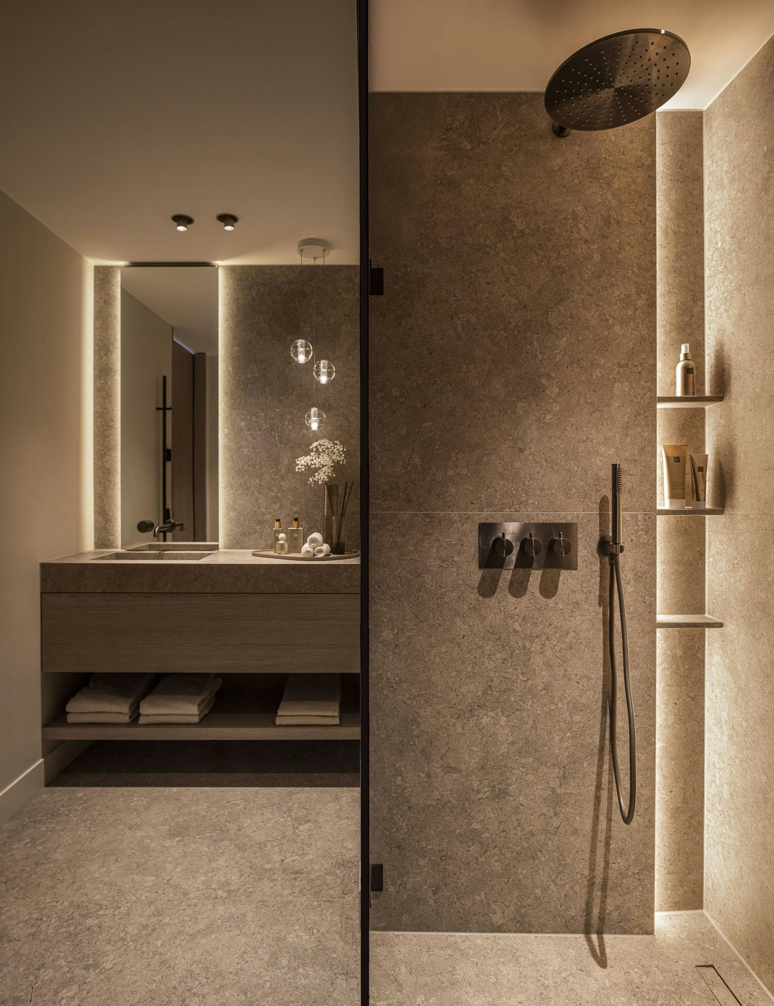 Voor de badkamer viel de keuze op Dekton Sabbia: een uitvoering met een licht geaderd, willekeurig en kleurrijk patroon vol nuances. Door dit materiaal consequent door te zetten in wand- en vloerelementen, wastafels, maatwerkdetails en sokkels, ontstond er één geheel. Het patroon trekt niet de aandacht, maar versterkt subtiel de natuurlijke en tijdloze uitstraling van de ruimte.