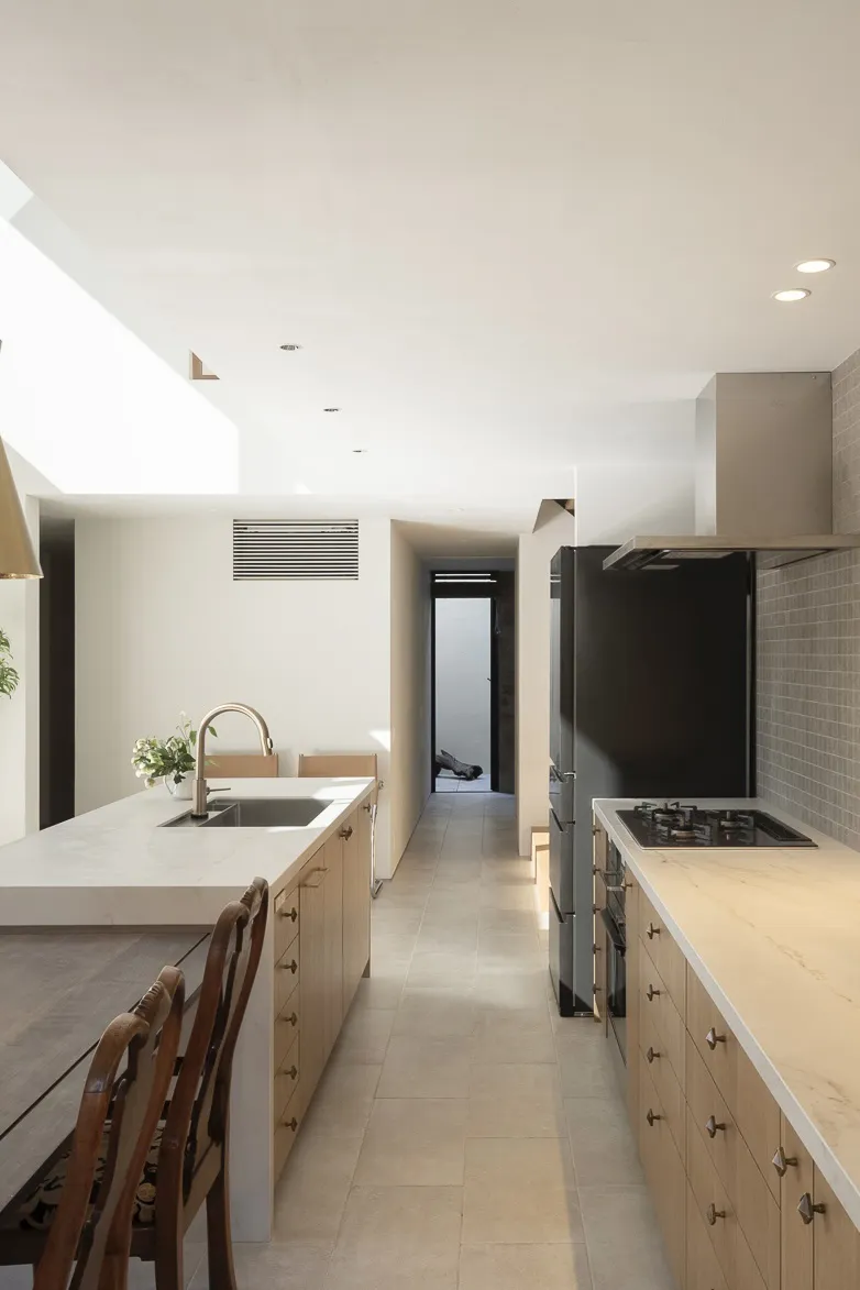 The kitchen layout directly reflects this idea of fragmented circulation and interconnected spaces. Thus, the island serves as a visual and functional axis, aligned with the side openings that connect to the interior gardens, ensuring that daily activities are always linked to the influx of natural light and vegetation.