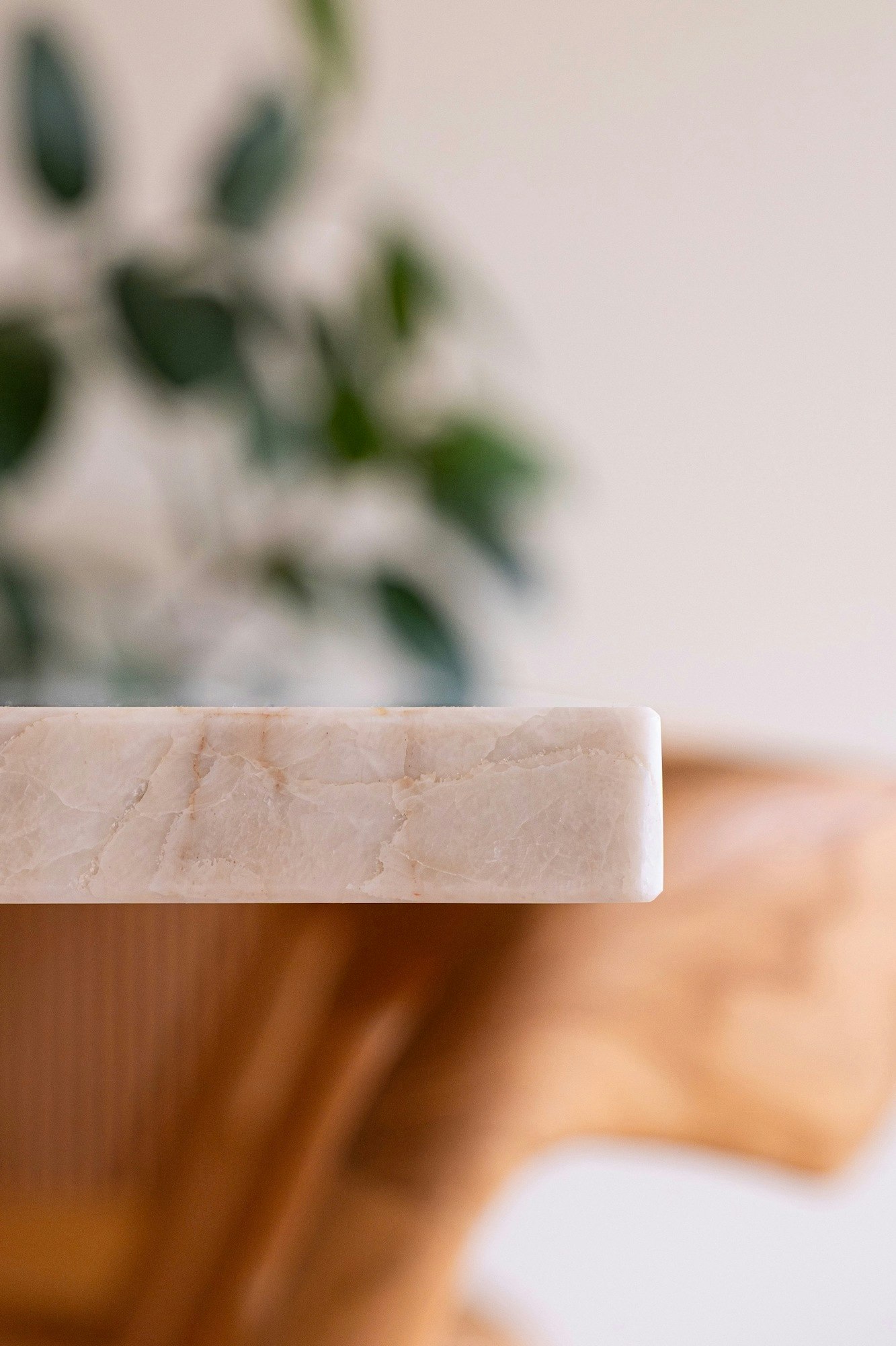 Upon entering the main room, the kitchen unfolds with harmonious simplicity. Vertical light wood, abundant natural light and clean lines compose a warm, contemporary setting. At the center of the design, Sensa Taj Mahal plays a key role—both aesthetically and functionally. Used on the backsplash, the countertop and the sculptural cylindrical table leg, this carefully selected granite reveals delicate grey and golden veining that animates the space with refinement.