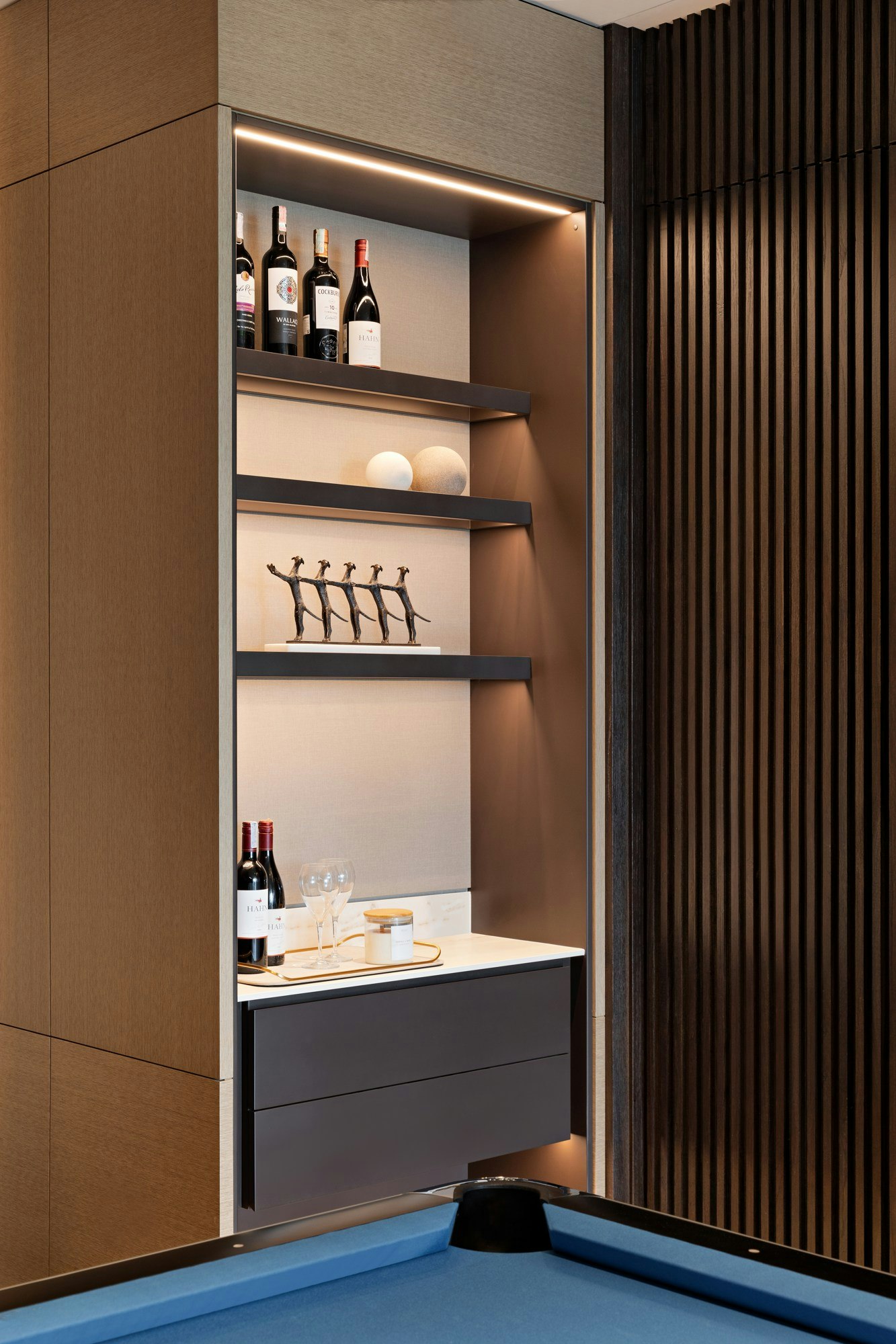 The material chosen to unify the spaces was Dekton Rem, applied across multiple surfaces: from the bar counter, breakfast table, and dining table, to the minibar in the master bedroom, bedside tables, worktop, kitchen island, and even the TV unit. 'We chose Cosentino materials because they align with a modern lifestyle. We educate our clients to select materials that are not only elegant and enhance the interior but also require minimal maintenance. This makes them a long-lasting and excellent investment,' the designers affirm.