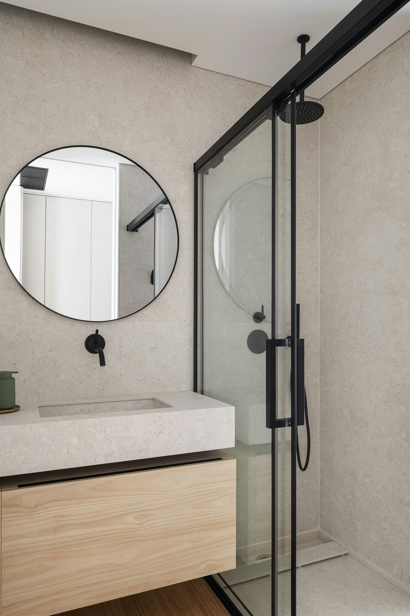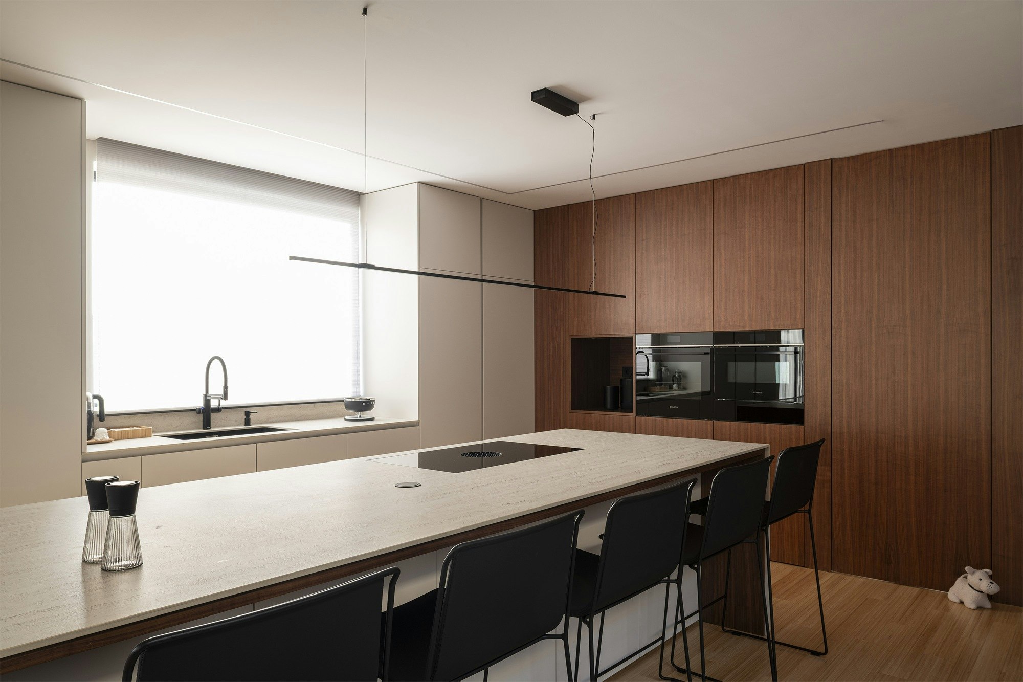 Dekton by Cosentino is present throughout the home, both in the kitchen and bathrooms, consolidating the idea of visual unity and material coherence. The architects explain: “The choice of Dekton as a cladding material in the bathrooms —applied to walls, floors, and integrated washbasins— reinforces the idea of unity and visual continuity, while ensuring resistance, durability, and ease of maintenance.”
