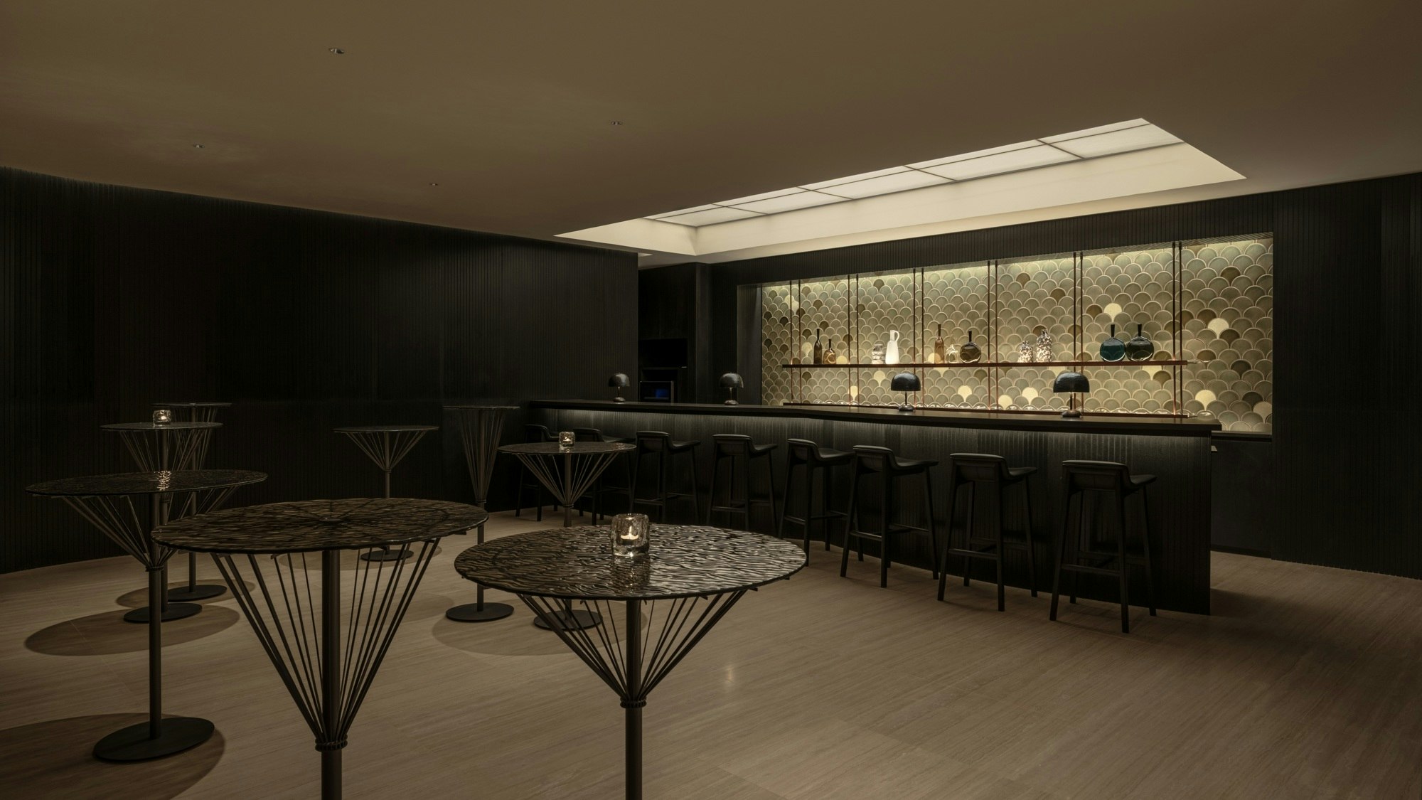 The bar, with its immersive shape and seamless design, rests on a vertical cladding of black slats that contrasts with the glow of the backlit background. The latter is composed of ceramic pieces shaped like scales, manually arranged to create a three-dimensional and almost aquatic effect. Diffuse lighting from the ceiling, with a large lightbox replacing the windows, floods the space with a soft glow, while bronze, charcoal, and amber tones reflect on the surfaces, enhancing the sense of calm and sophistication.