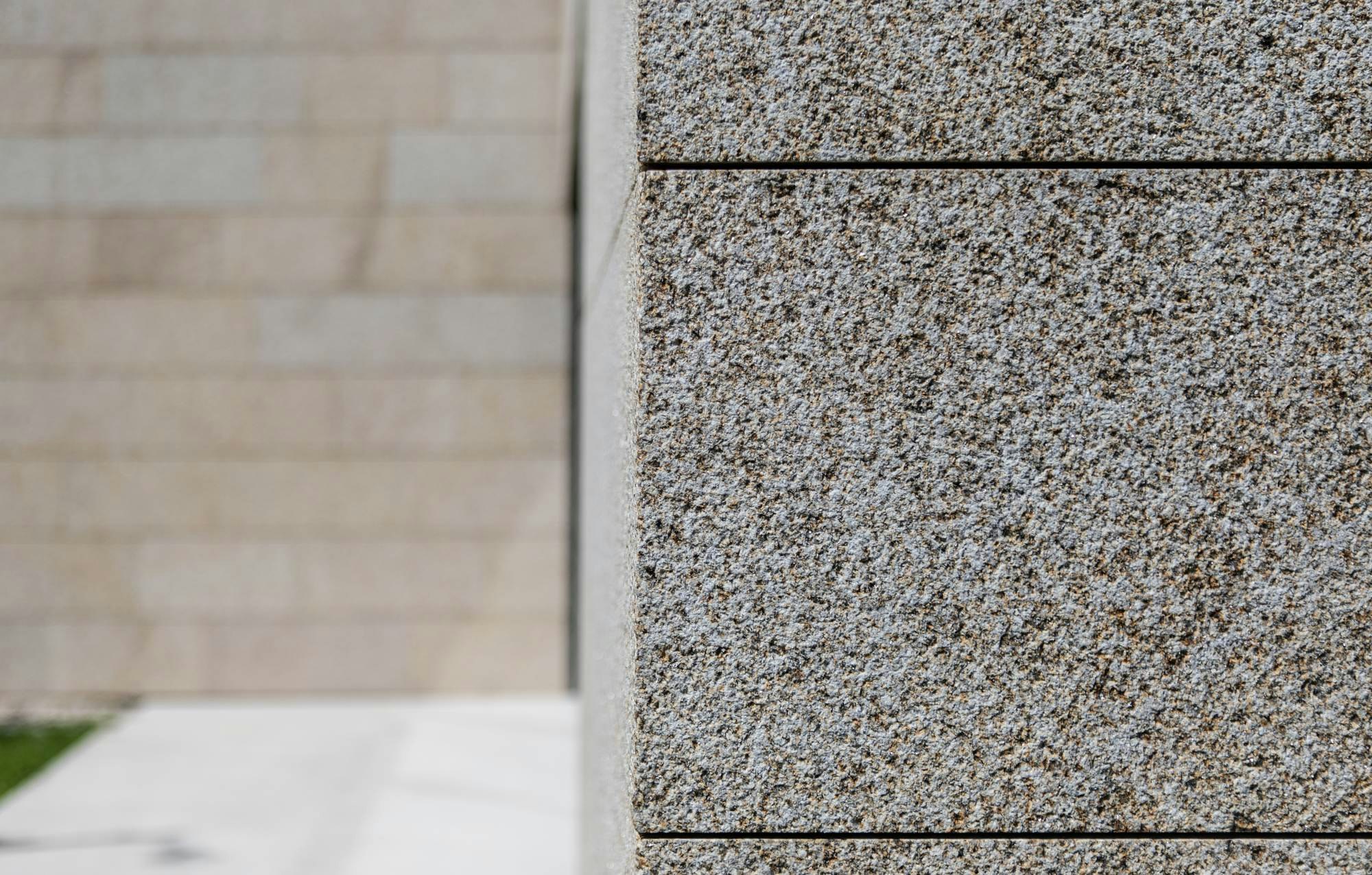 The 30 mm thick pieces were fixed using a ventilated façade system with continuous horizontal profiles, whose tabs are concealed in the grooves made on the upper and lower edges. The fine grain of this type of granite provides greater compactness and homogeneity, allowing for cleaner machining and grooving. This, combined with the layout prioritising the horizontal continuity of the joints, facilitates easier installation with this system, commonly used in ventilated façades of natural stone.