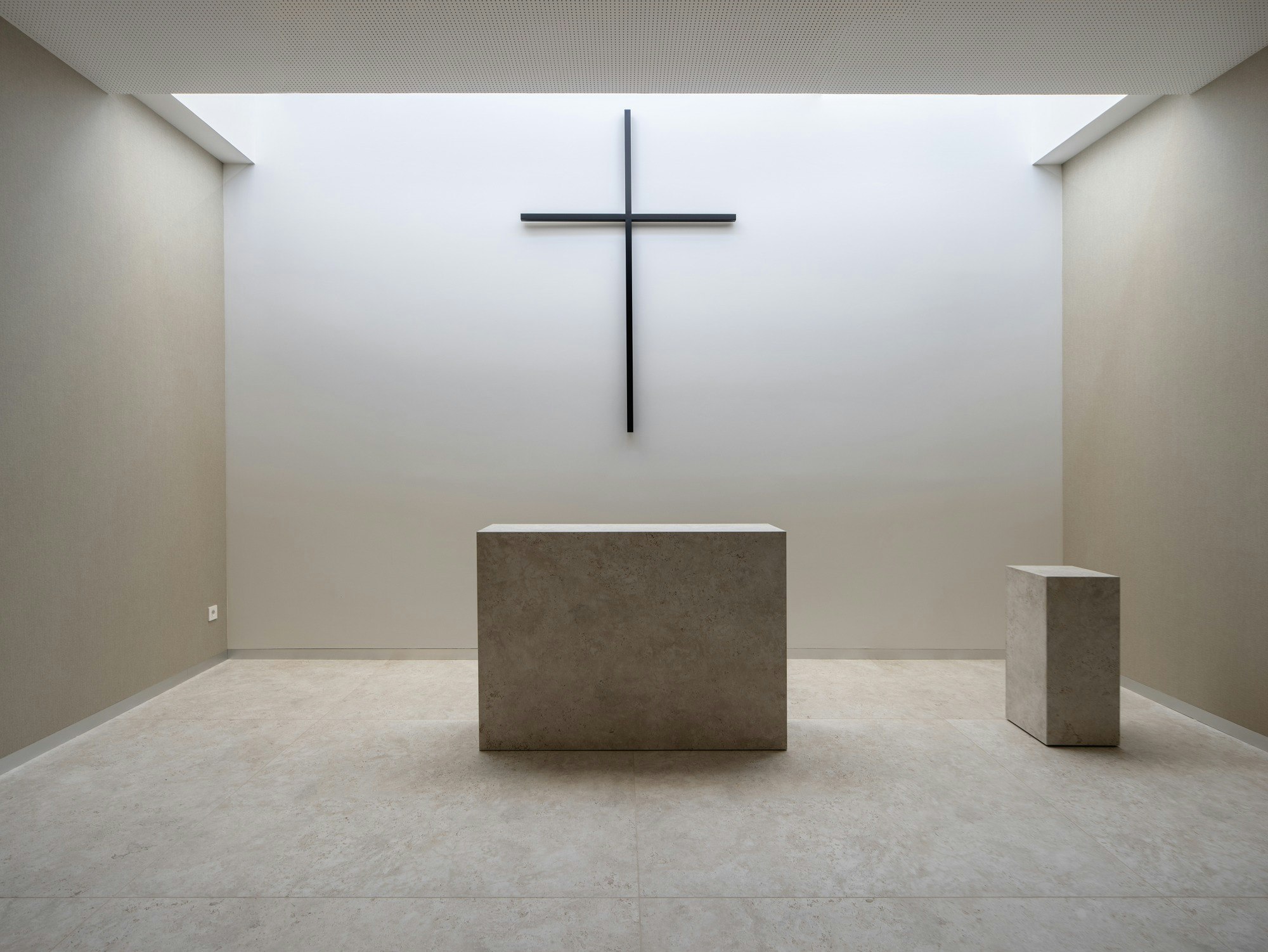 The articulation between both materials is seamless. On the exterior, the natural stone Scalea shapes the building's personality; on the interior, Dekton Sabbia enhances this intention by providing a technical surface with a neutral yet rich finish. The building thus coherently meets two distinct requirements: the envelope must withstand external conditions (humidity, climate changes, radiation), while the chapel must offer a serene, clean, and durable environment without compromising the material's texture.
