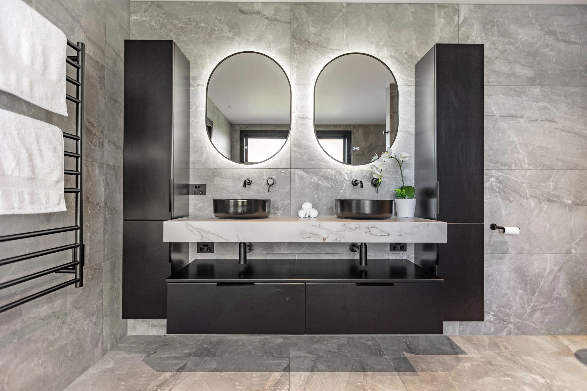 The variety of thicknesses was also crucial. “In the media room, we needed the material to match the thickness of the wooden slats while also being heat-resistant; whereas for the splashbacks and basins, it needed to be lighter and more durable.”