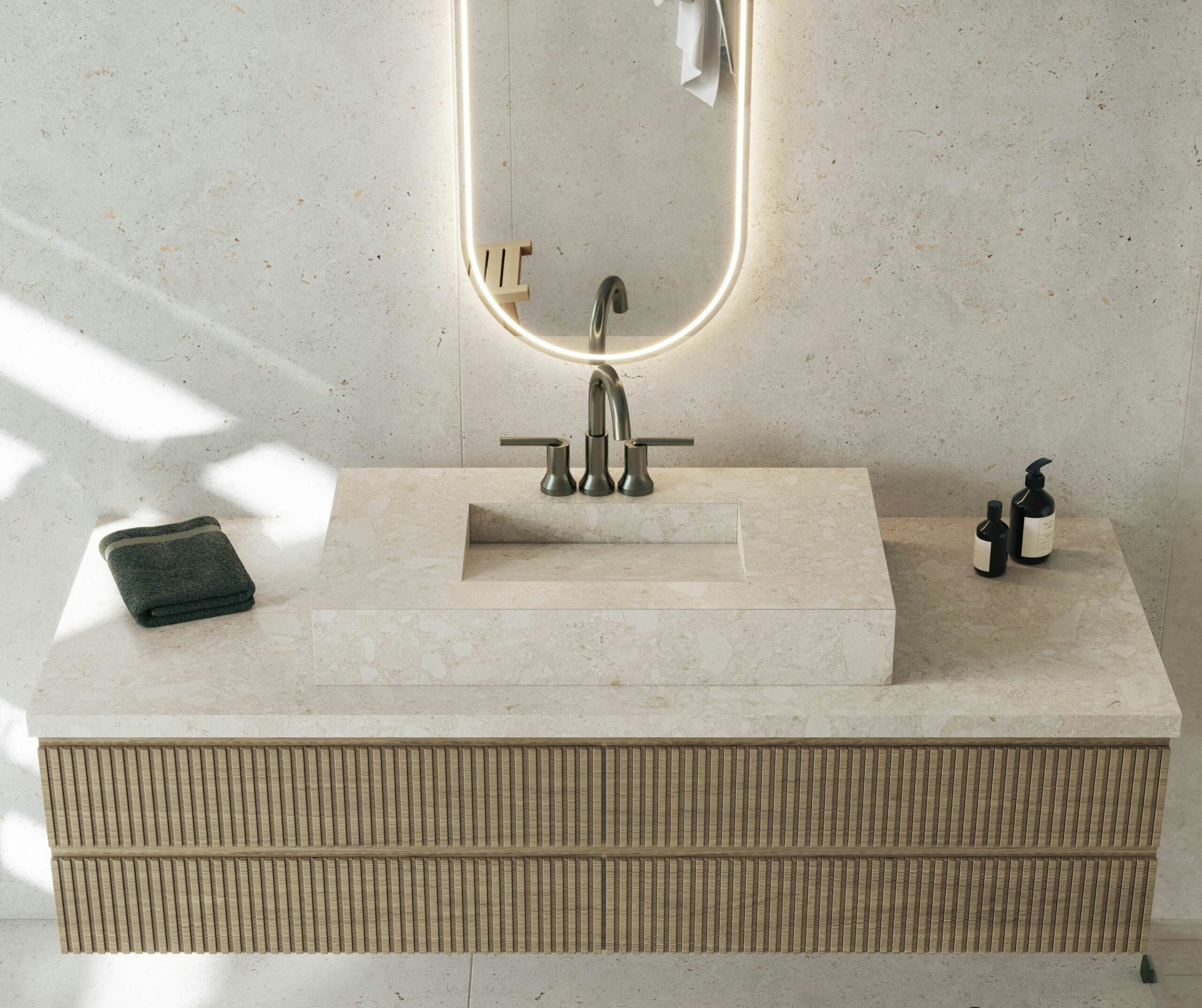 De douchebak en de bekleding in het natte gebied worden gecombineerd met de wastafel en het wastafelblad in Dekton Ava, een heldere herinterpretatie van de Ceppo di Gré-steen. Voor de vloer en de rest van de muren was de gekozen kleur Polar, een herinterpretatie van de visuele rijkdom van Campaspero steen met een uniek hyperrealistisch patroon.