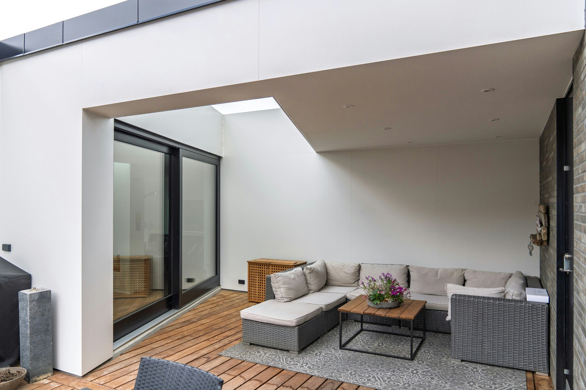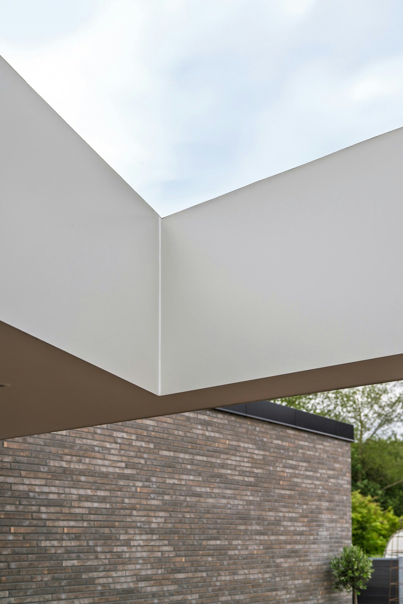 The façade is clad with Dekton Uyuni, applied using a bonded system that covers the main surfaces of the structure. This pure, luminous white material enhances the brightness of the home, accentuating the contrast with the dark brick elements, natural wood, and large glazed surfaces that characterise the project.