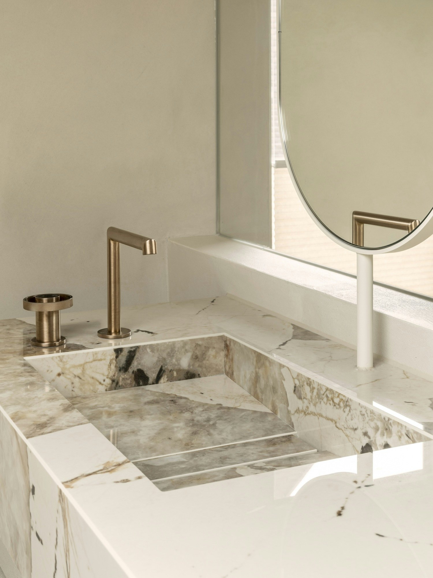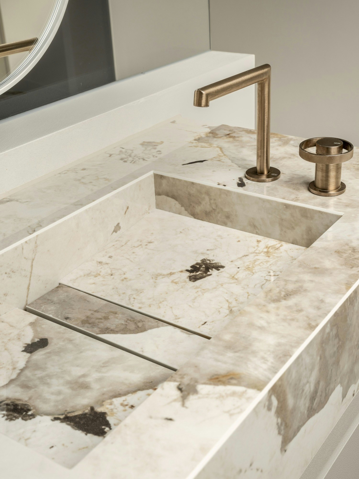 Het meest interessante architecturale en decoratieve kenmerk in dit project is de op maat gemaakte wastafel van Dekton Khalo. Samen met de schuine glazen wand in de douche vormt dit een combinatie van sculpturale elementen en functionele architectuur die de ruimte karakter geeft. De balans tussen rust en expressie was hierin leidend.