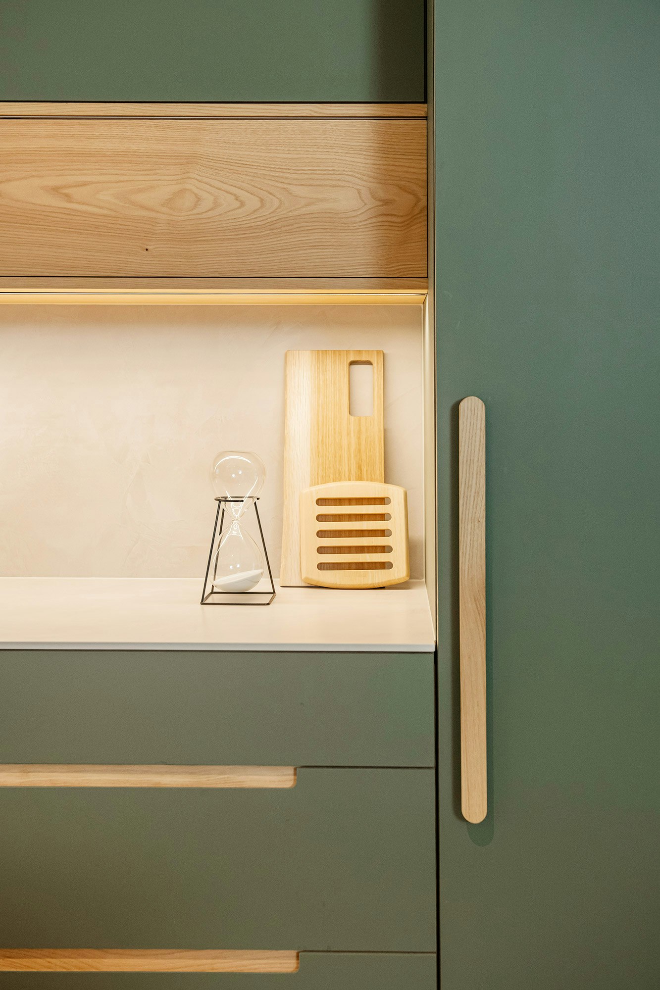 The kitchen in this Bremgarten home is designed with a fluid and warm language, following the premises set for its design. “The space already had a cosy look thanks to the choice of textured oak materials and green linoleum. Therefore, we designed the worktop and the back wall with the idea of creating a sense of calm and warmth. We opted for organic shapes, and it became clear that the island had to have an elegant design with rounded edges,” explain Hüsser Innenausbau AG, the company in charge of the design.