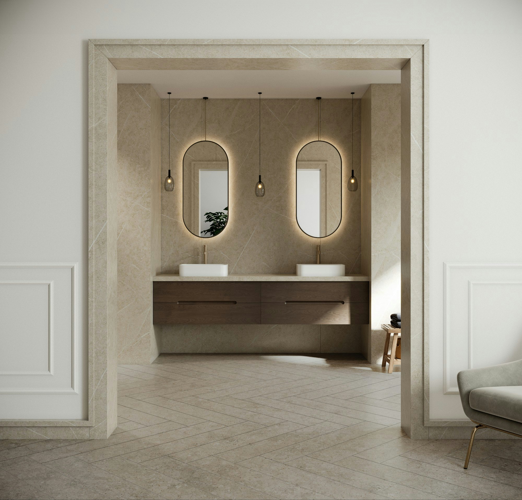 In deze badkamer is de zijdezachte Dekton Adia uitgebreid gebruikt, van de muren tot het werkblad en architectonische elementen zoals de plinten en deurstijlen.