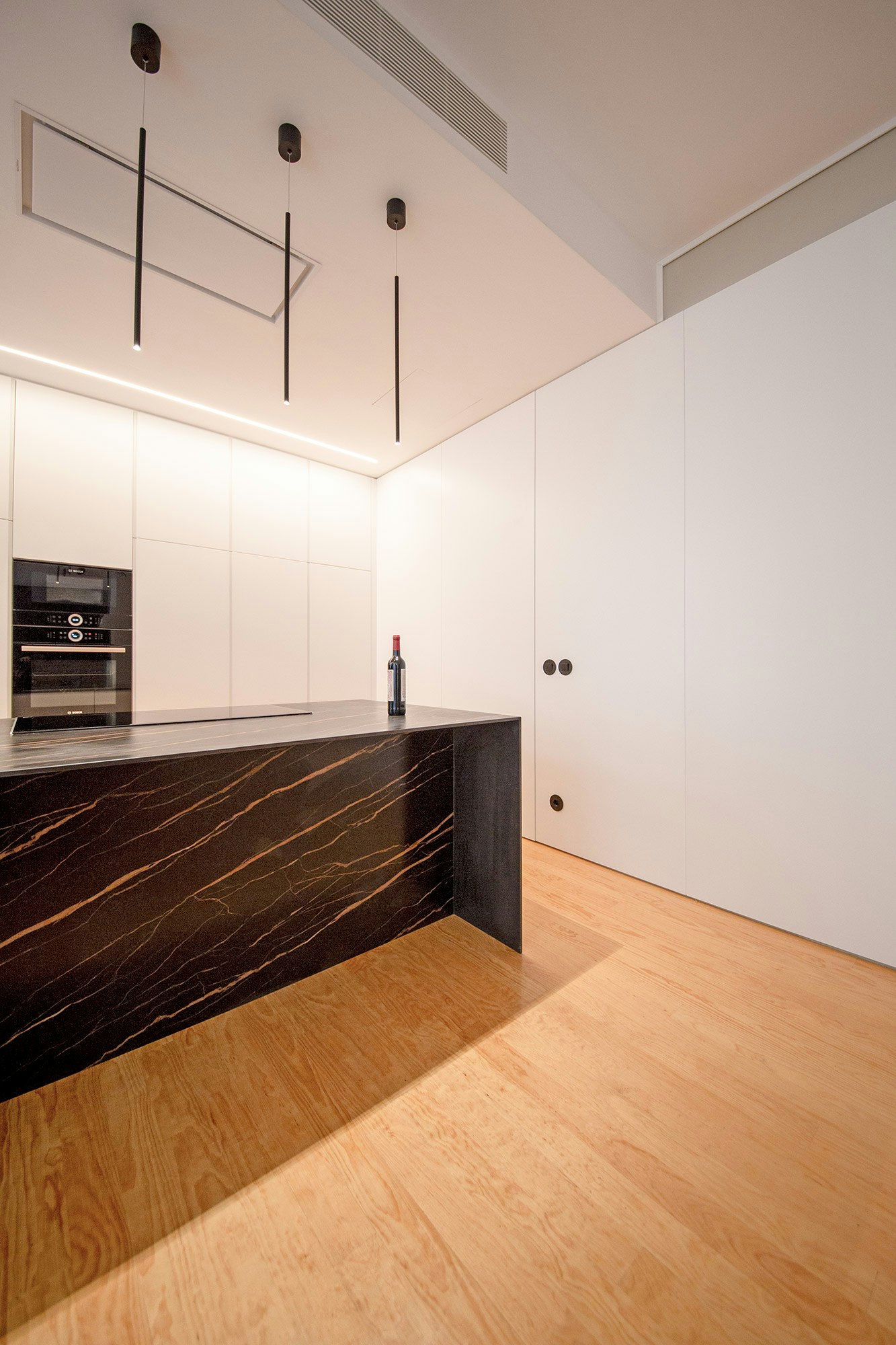 The decision to use large formats allowed for the elimination of visible joints and enhanced continuity, reinforcing the sculptural reading of the volume. The designer explains that the use of Dekton enabled “the creation of a stereotomy consistent with the building's cast iron elements and the pattern of the pine flooring,” a relationship of materials that defines the project's identity.