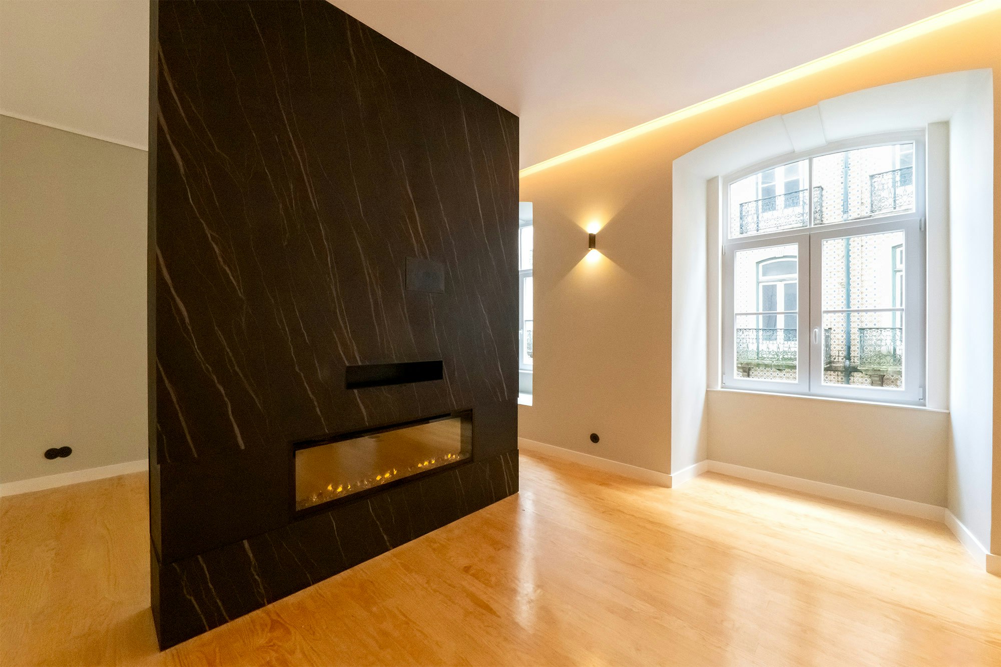 Its dark surface, inspired by natural stone with golden veins, introduces a bold presence amidst an environment dominated by the warmth of wood and the brightness of whitewashed walls. The material is integrated into two strategic points of the apartment, the kitchen and the fireplace, and in both, it becomes an architectural feature rather than just a mere cladding.