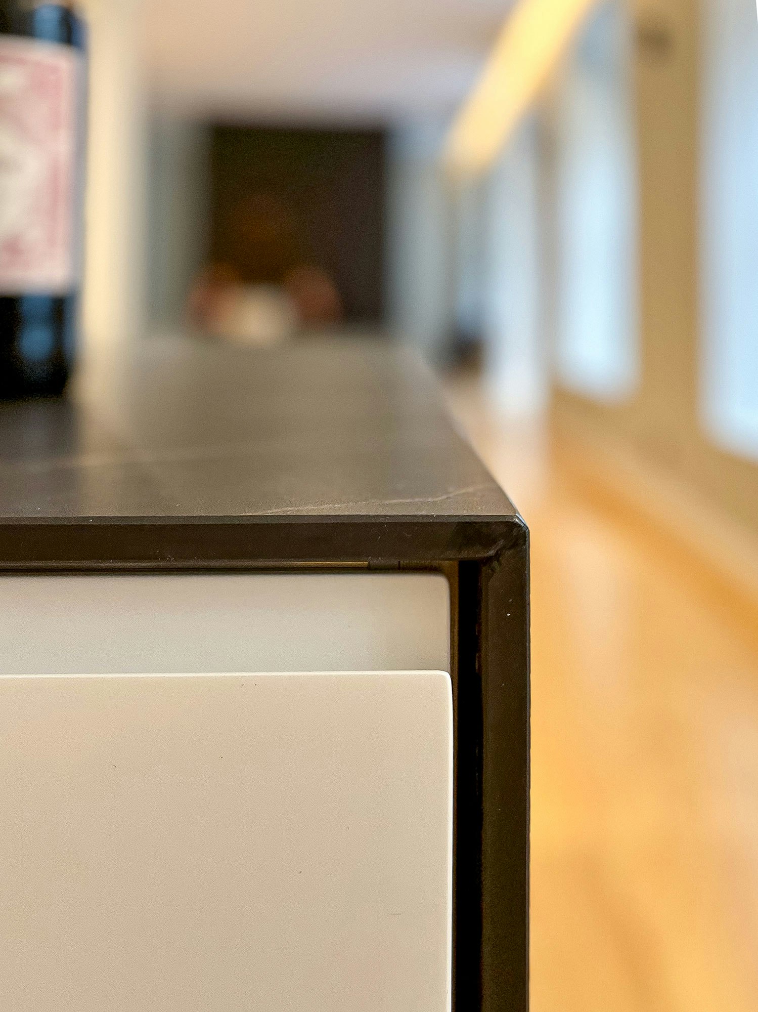 The fireplace mirrors the same design language. Located on the opposite wall, it is also clad in Dekton Laurent, reinforcing the visual symmetry with the kitchen and creating a correspondence between the two planes. The dark surface extends to the floor and lintel, integrating the fireplace into the architecture rather than presenting it as an addition. The adjustment work was meticulous: the joints between the different planes were carefully studied, as was the material's behaviour in response to temperature variations, leveraging its thermal stability and resistance to expansion.